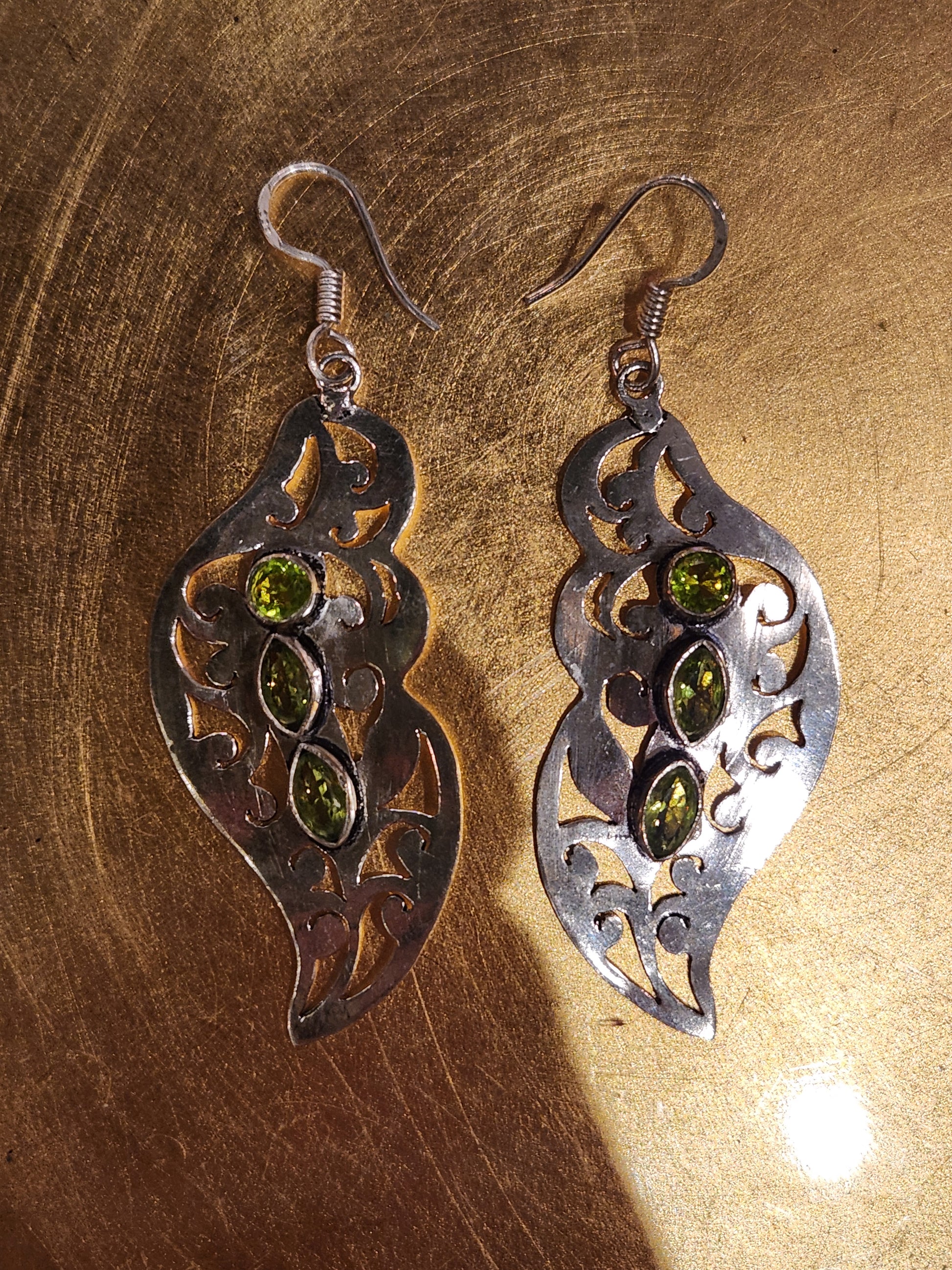 Celebrate nature-inspired elegance with these exquisite green crystal leaf dangle earrings. Intricately crafted metal leaves feature delicate cut-outs that create stunning shadow play and visual interest. Petite green crystal accents nestle perfectly within the design, adding a pop of color and sparkle.ย