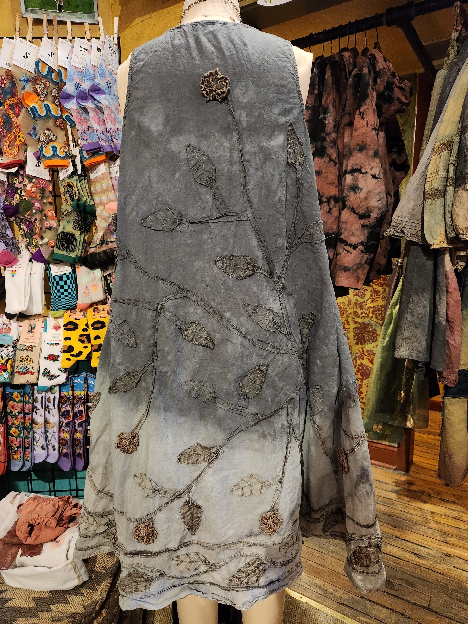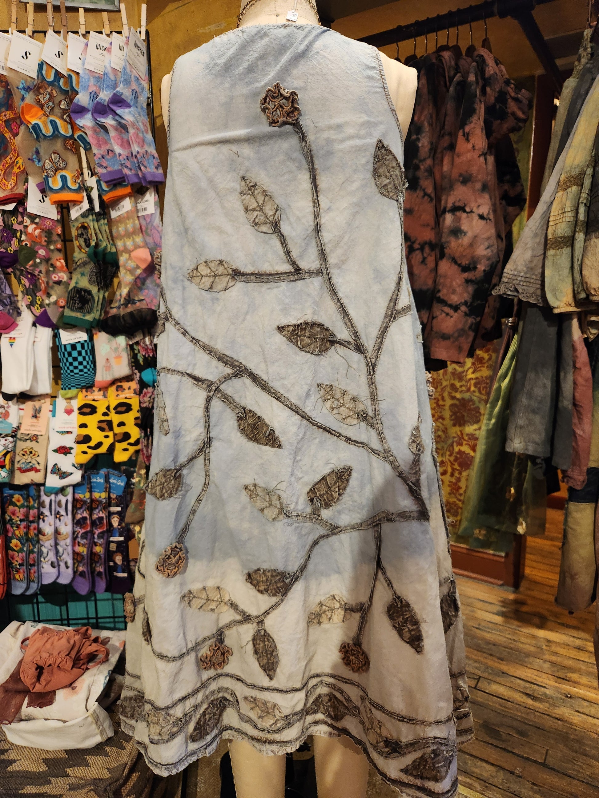 Hand dyed 'Paper Lace' dress, adorned with nature themed patchwork, multiple variants available.