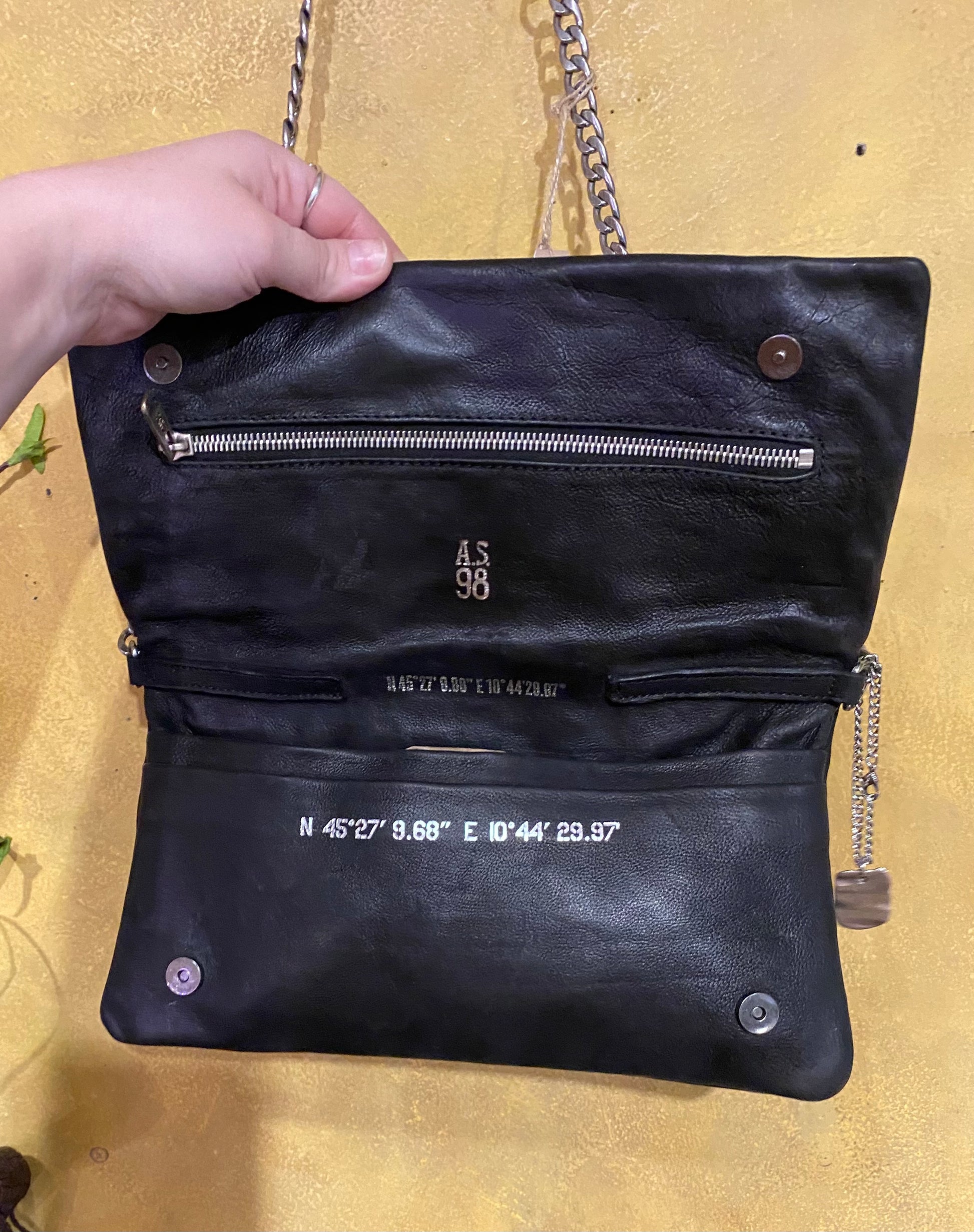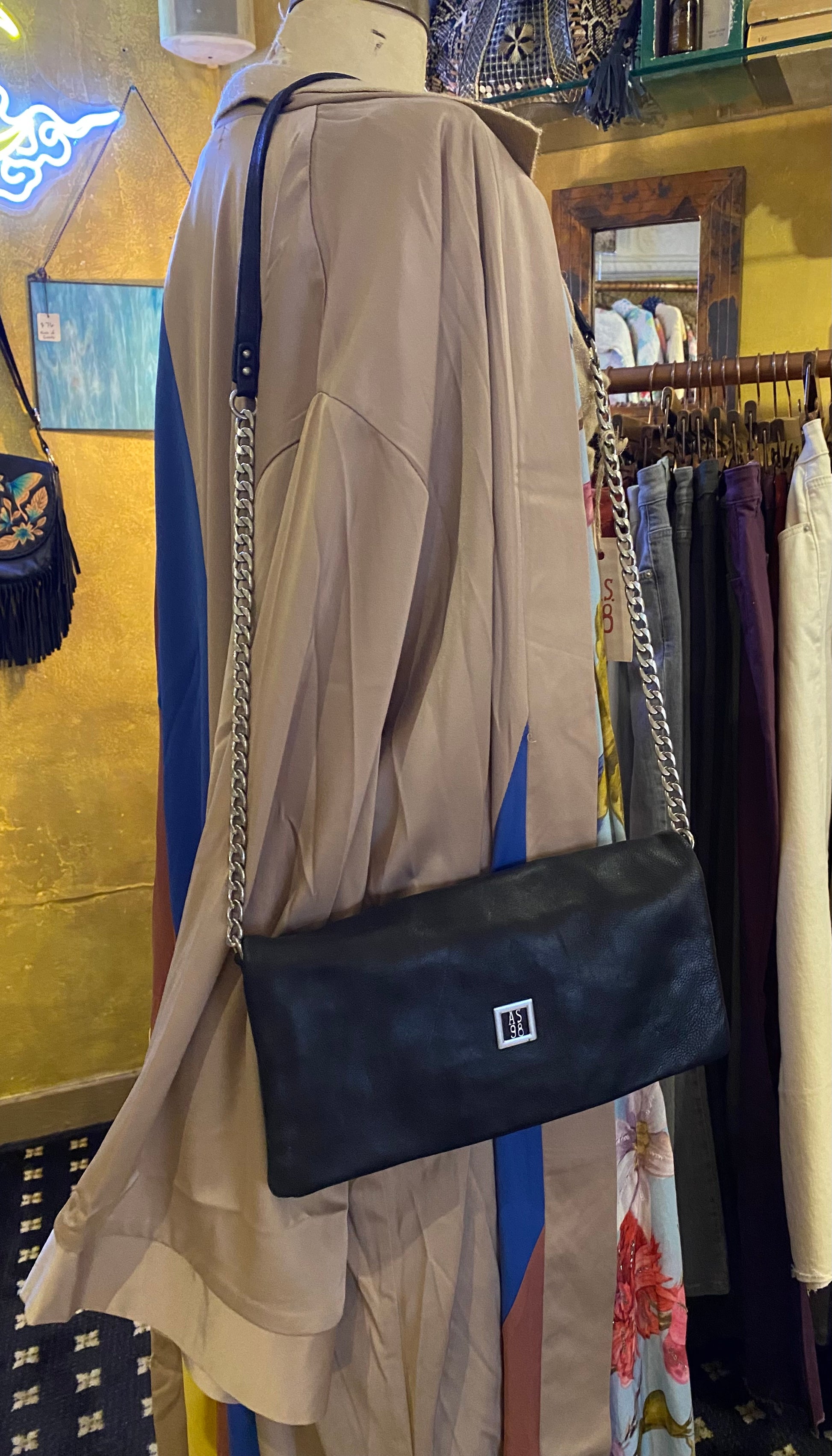 The Hawkins Leather Crossbody Bag in black combines sleek design with practical features. Its flip-top clutch style offers easy access, while the chain and leather crossbody strap provides stylish versatility. Inside, multiple pockets keep your belongings organized and within reach. Accented with signature A.S. 98 charm and emblem, this bag elevates your look with a touch of distinctive elegance.