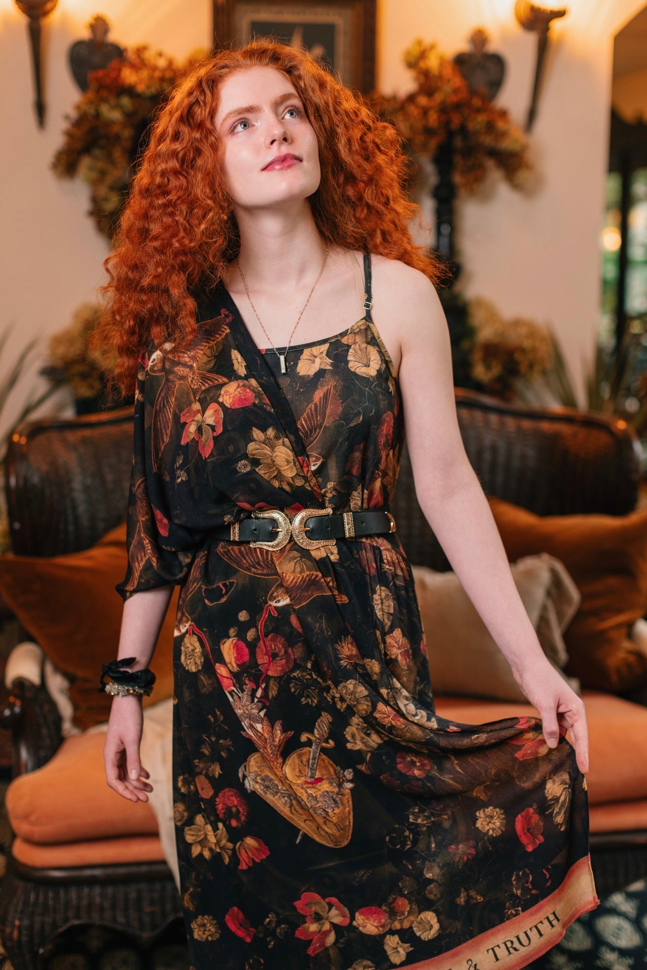 Introducing Heart of Gold — our beautiful & dramatic new collection that celebrates the bonds in our lives that endure — love, truth, and loyal friends! Designed using an intricate collage of antique artwork, it features hand-painted swallows from an 1865 scrapbook, floral wreaths by artist Karel Batist done in the 1600s, and a very special sacred heart from Notre Dame in France, which was embroidered with gilded thread and completed in 1872. This print is rich in history, but also in meaning. The two swallows with wings outstretched (traditional symbols of loyalty) carry a ribbon between them as a reminder that even across distances, those we love will always be a part of us. The vintage banner, pulled from a Victorian-era painted sign, proudly displays the motto “friendship, love, and truth”: a simple but significant declaration of what truly matters—the threads that tie us to each other, the loyalty that stands the test of time, and the love that makes it all worth it.