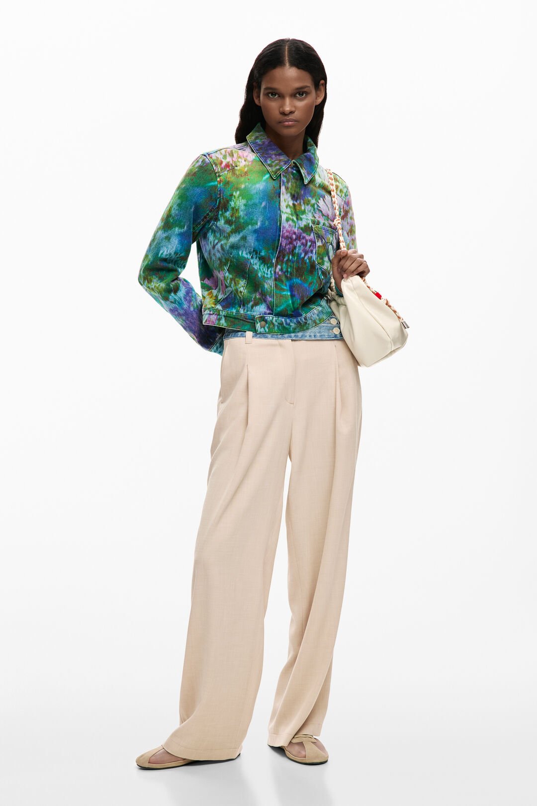 Jacket made of denim fabric with a button placket cover detail, embroidery on the pocket and a floral print.