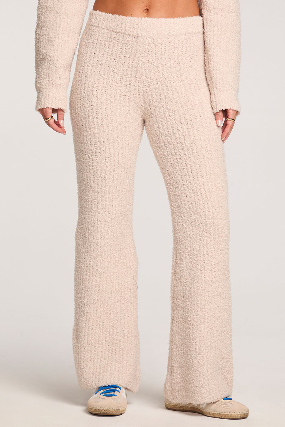 The Kael Pearl Pant combines comfortable sophistication with a chic lounge aesthetic. Crafted from soft, fuzzy textured fabric, its pull-on style and wide legs with a slight flair offer effortless wear and graceful movement.