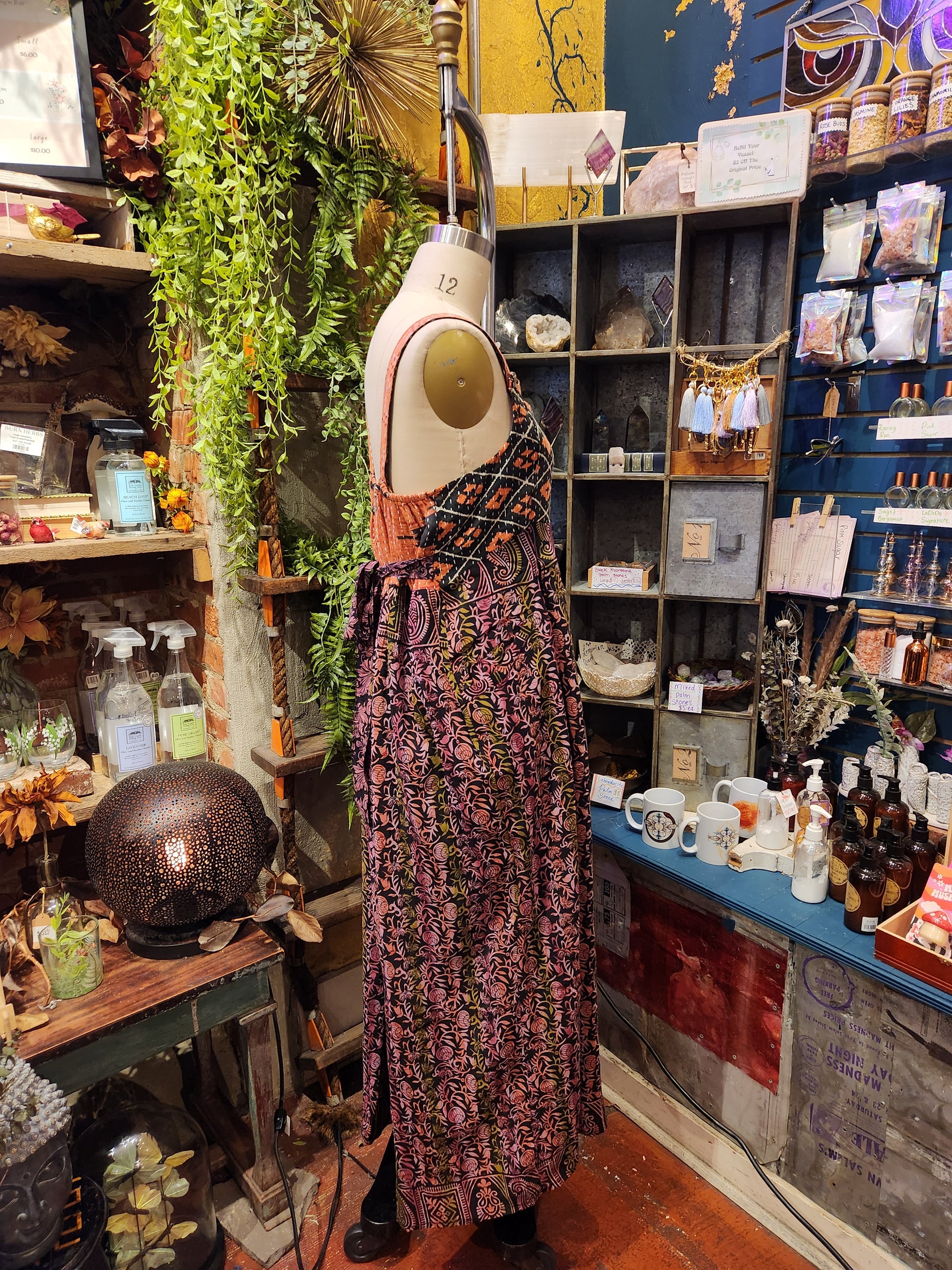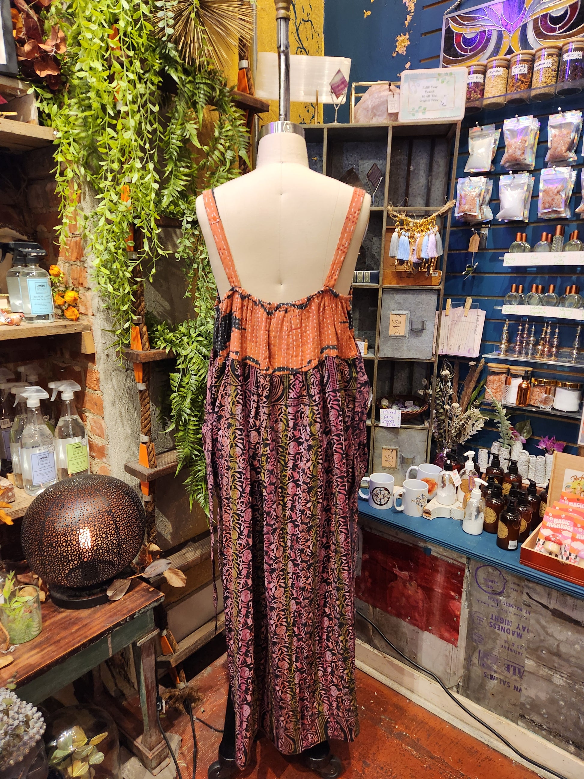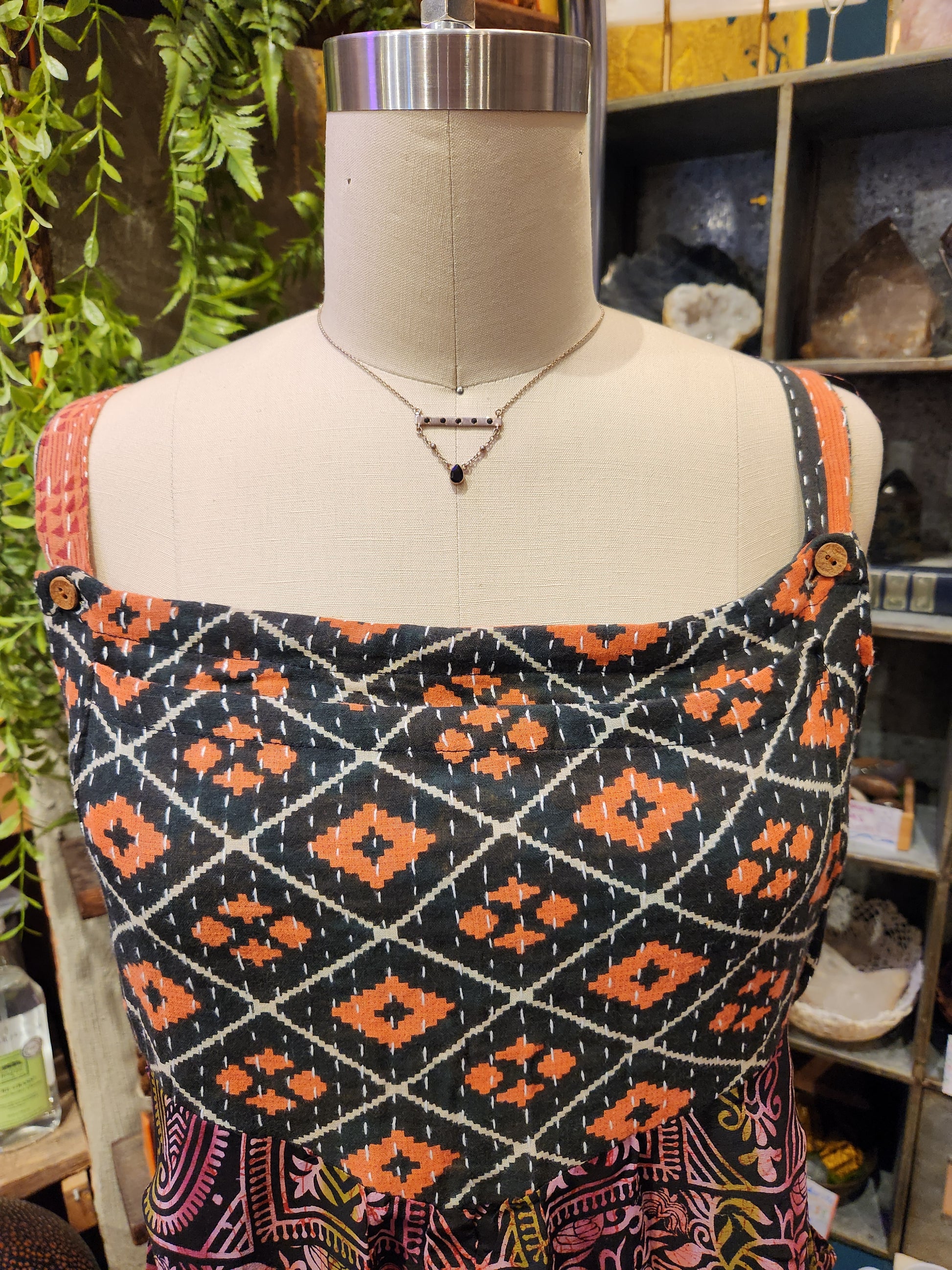 Perfect for EVERY season this overall dress features a kantha bib front with center pocket, adjustable button straps, tie back, crepe skirt and interior pockets on the skirt.