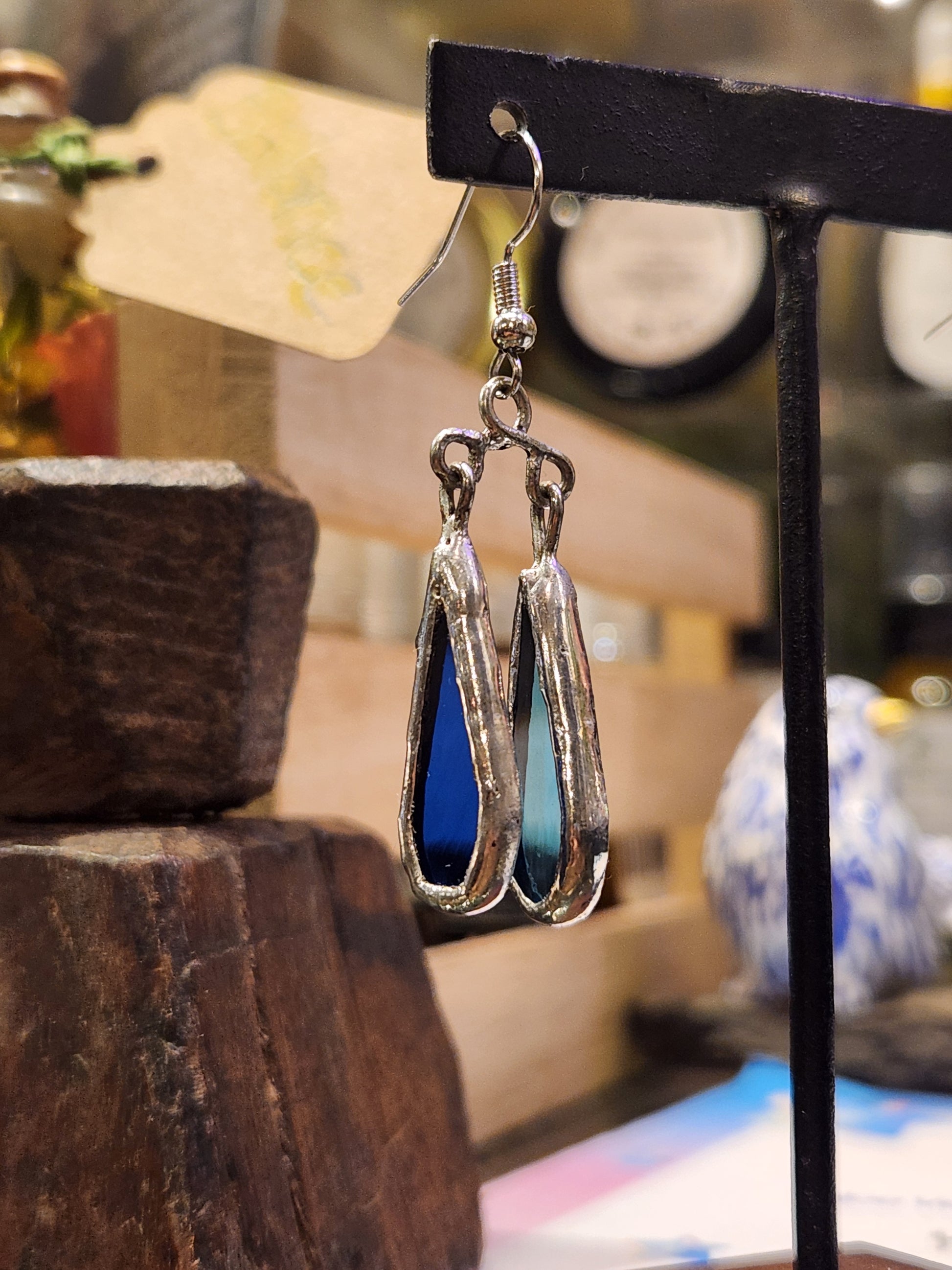 Mismatch rain drop and lightning bolt stained glass earrings. Hypoallergenic stainless steel findings, and lead-free solder.ย