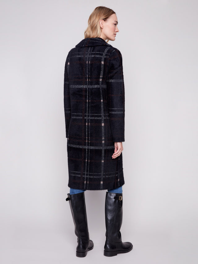 Embrace elegance this fall with our black Long Plaid Knit Coatigan! This chic blend of comfort and style features a mocha plaid pattern and a flattering lapel collar. Perfect for cozy evenings or crisp autumn days, this button-front coatigan will quickly become a wardrobe staple.