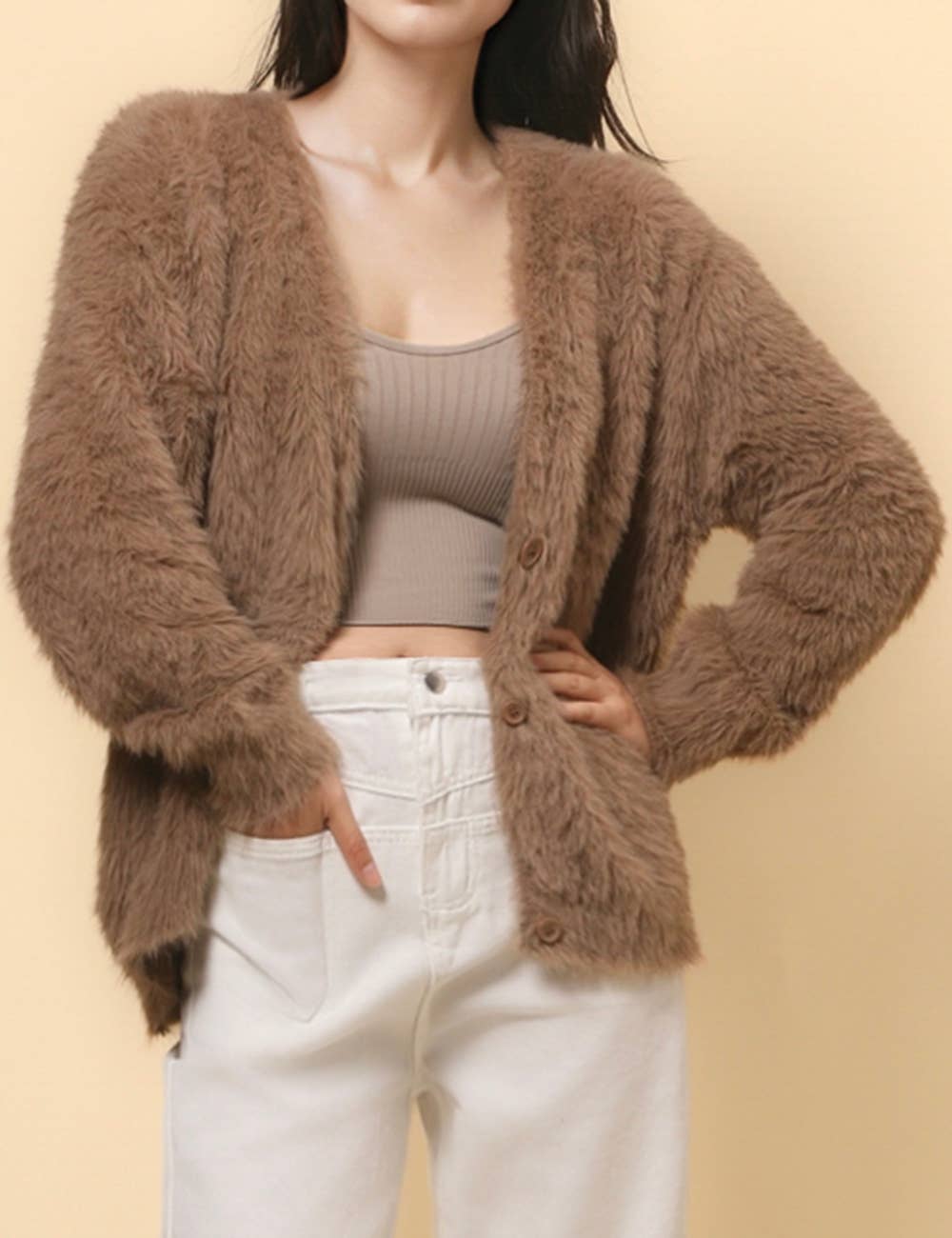 Ladies Solid Color Faux Mink V-Neck Cardigan - Khaki