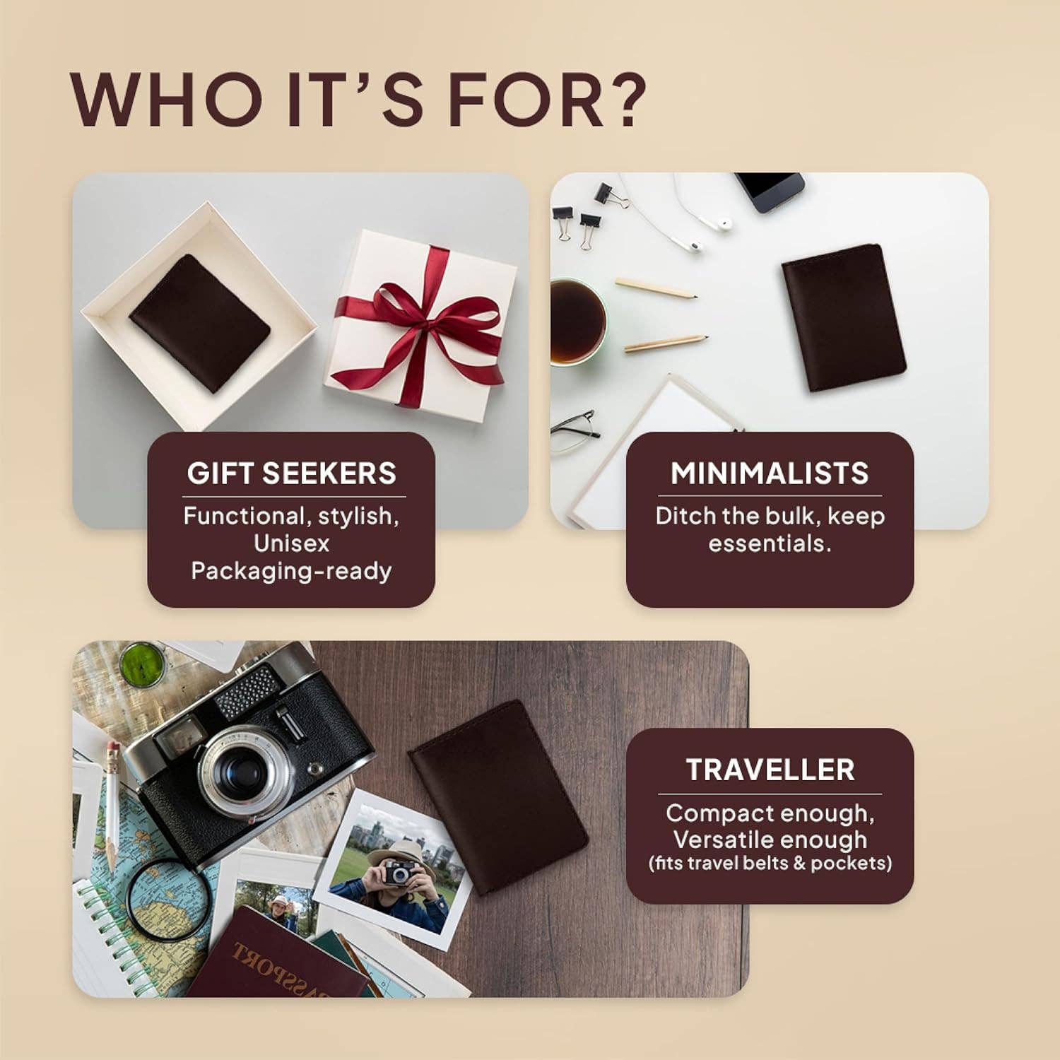 Durable, stylish, and naturally aged for a unique, timeless look. • Smart Capacity & Organization – Designed with dedicated slots to hold up to 6 cards plus cash, this compact leather wallet balances minimalist style with everyday functionality. Versatile for Men & Women – Works as both a men’s and women’s credit card holder, money organizer, and even a passport holder—making it a practical unisex accessory. Travel-Ready & Multi-Functional – Use it as an AirTag wallet, or a compact travel wallet. Perfect for keeping essentials safe and organized wherever you go.