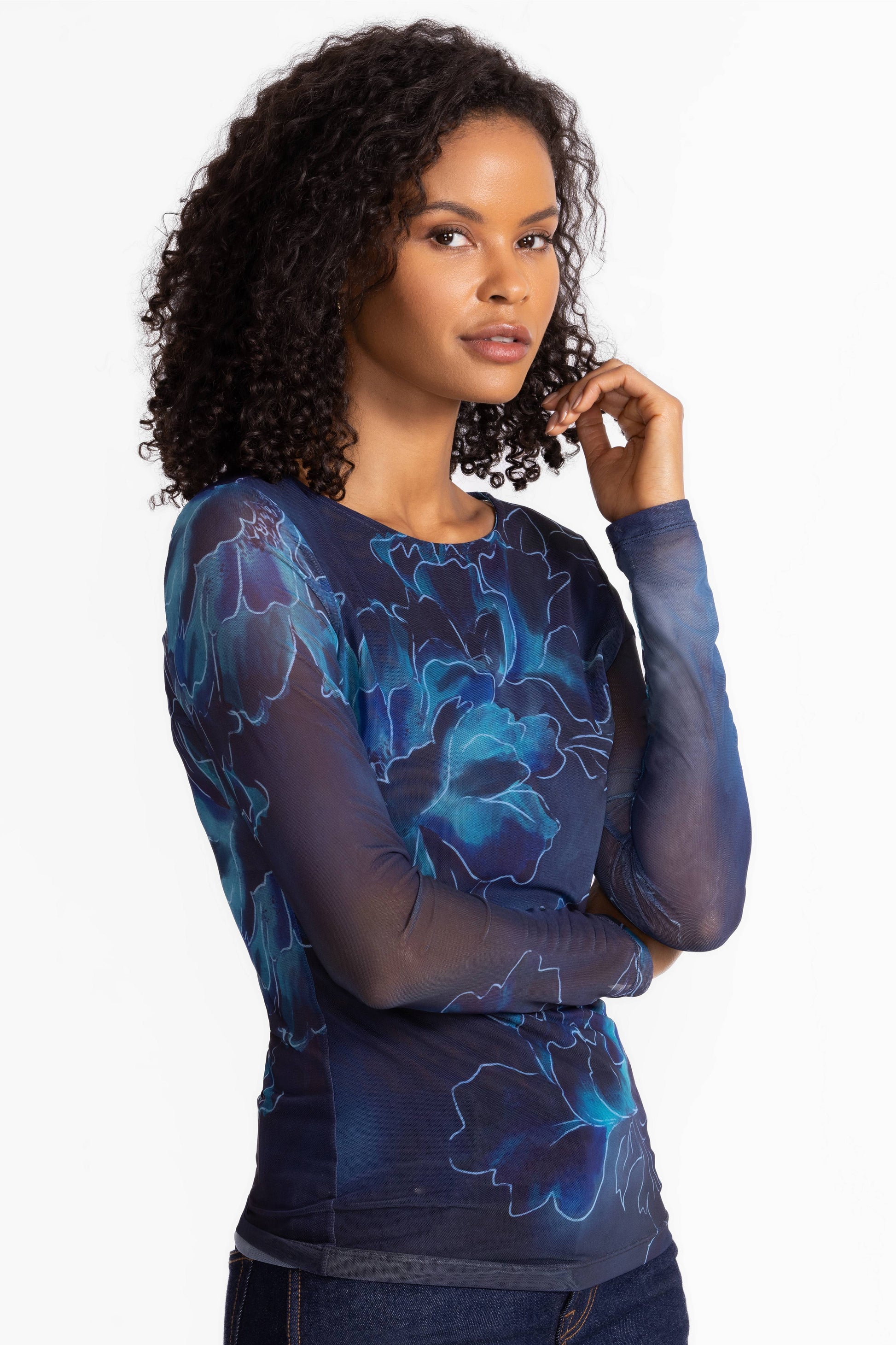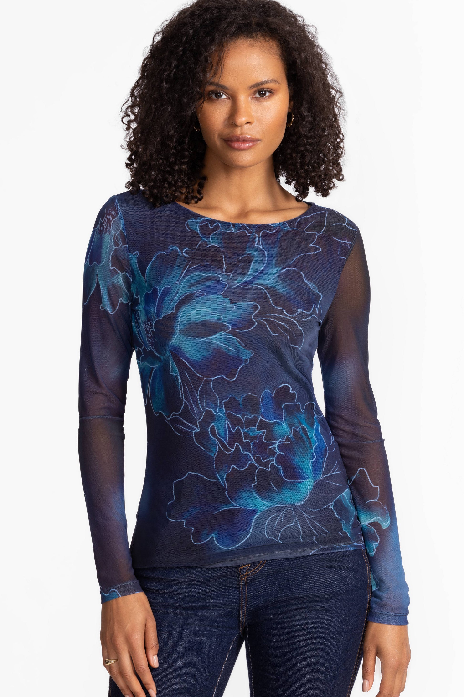 Embellished with a vibrant floral pattern in hues of blue, the Long Sleeve Boat Neck Mesh Tee offers a fresh take on a wardrobe staple. Designed with a boat neckline and long sleeves, this lined tee is crafted from a lightweight, breathable mesh. Pair with classic trousers and layer with a blazer for a modern workday look.