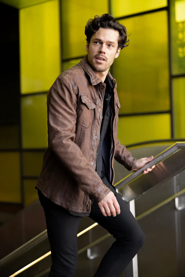 The Sedro Leather Jacket is a timeless button-down design crafted from soft nubuck leather, combining durability with understated style.