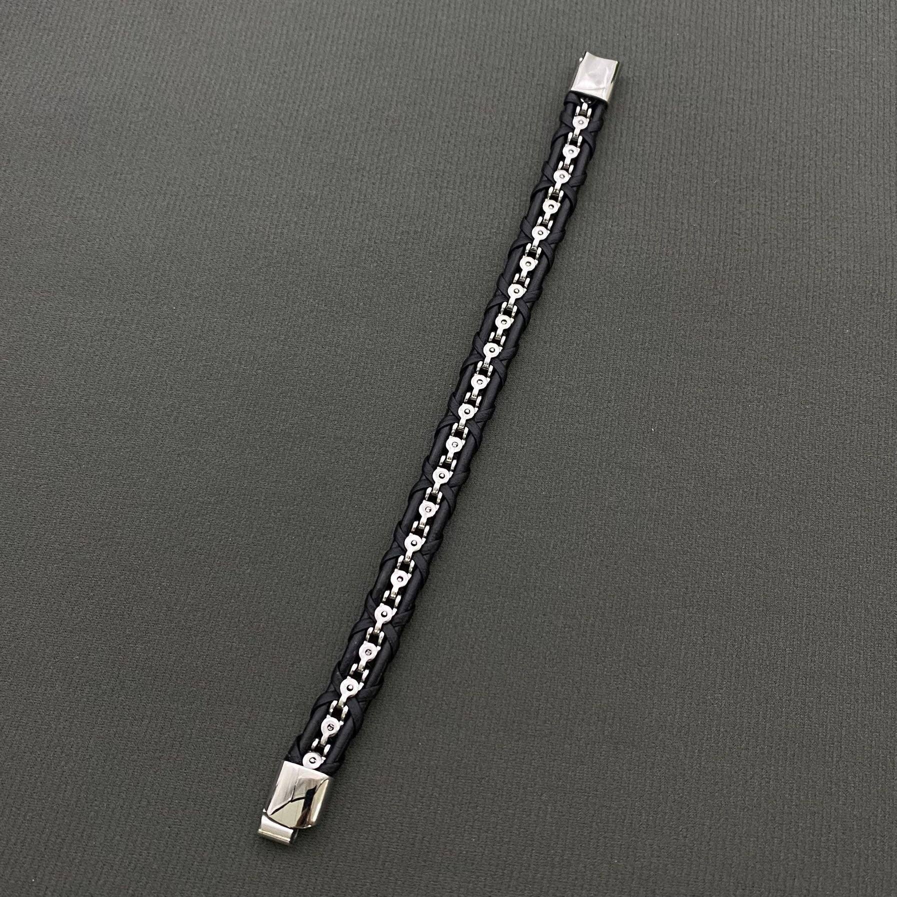 Men's Stainless Steel Chain PU Leather Woven Bracelet