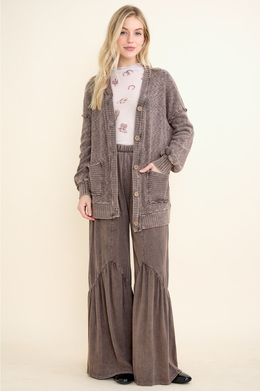 Embrace effortless layering with this mineral wash button cardigan, crafted for comfort and style. The soft, ashed oak hue pairs seamlessly with any wardrobe staple, while functional pockets add practical appeal. Designed with a relaxed fit and cozy fabric, this sweater cardigan transitions beautifully from casual days to weekend getaways. The classic button front makes it easy to adjust warmth on the fly. Perfect for those who value both comfort and versatility in their everyday essentials.