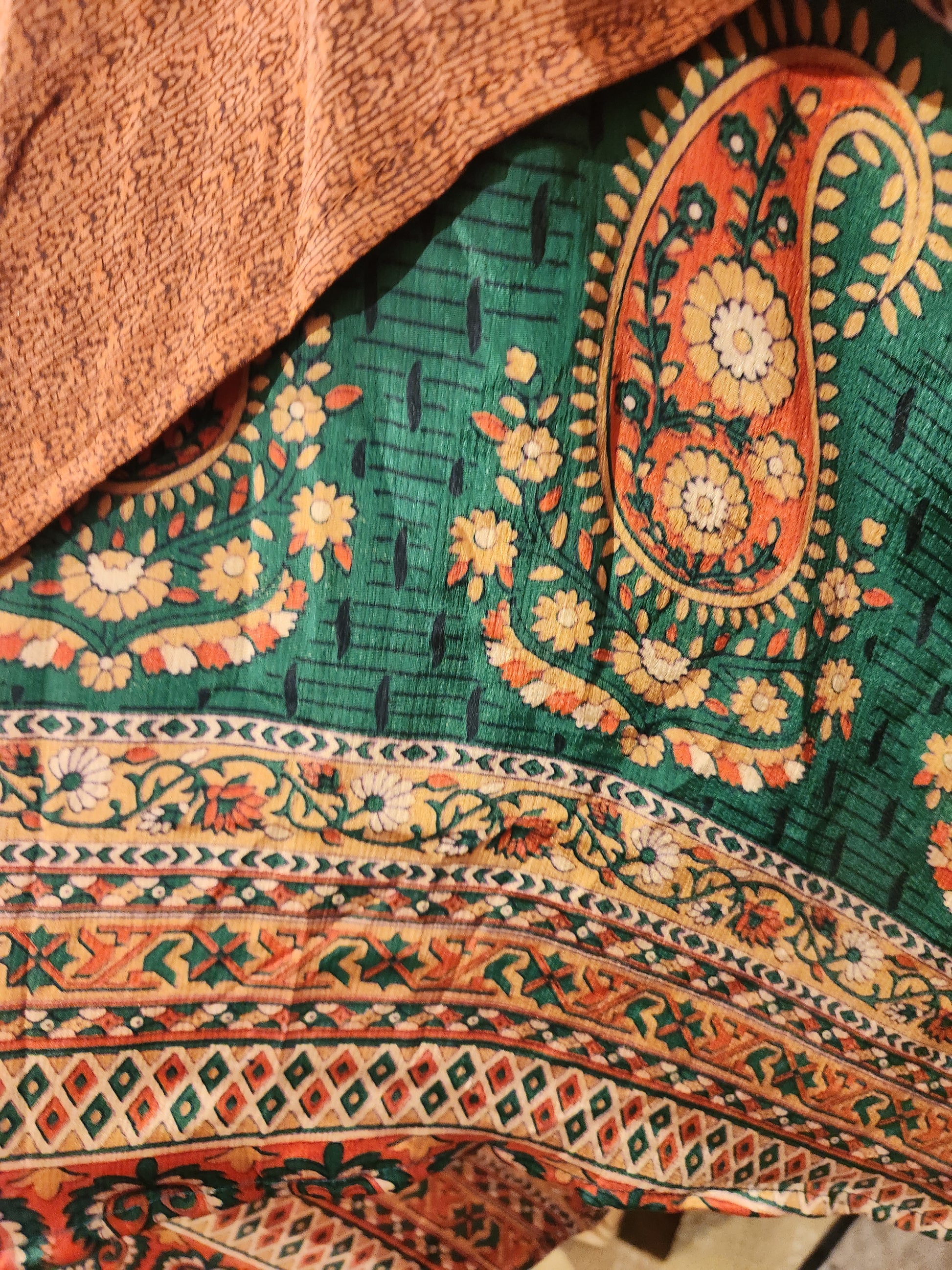 Fabrics may have small threads or holes in the layers. Color inconsistency or small stains may be present. The saris are sewn together and extend the life of each design. Imperfections should be celebrated.
