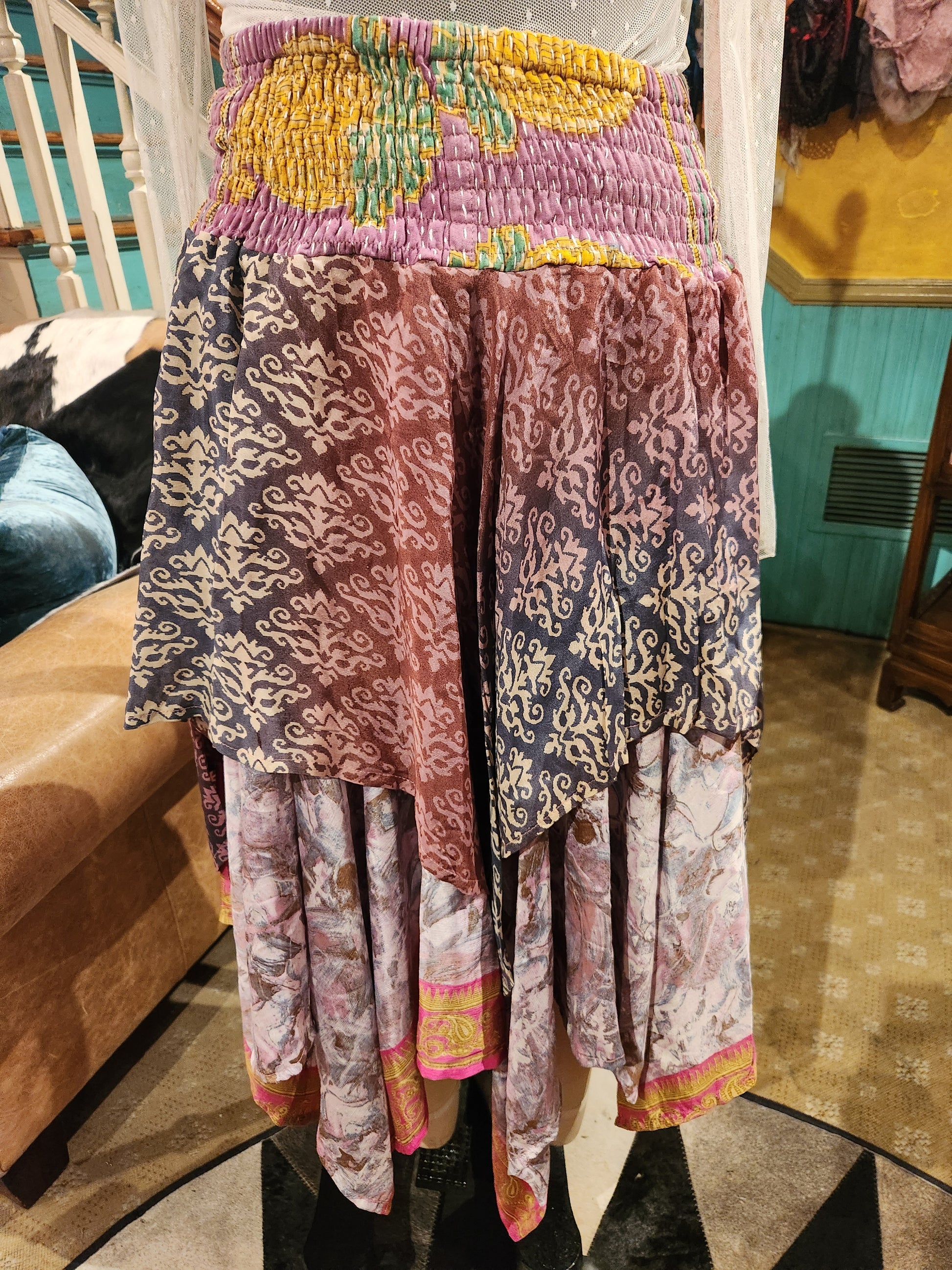 Crafted from our ultra lux vintage crepe and ragulla sari. Features a rock star asymmetrical hem and stretchy pareo kantha waistband. This versatile piece can be pulled up to be worn as a tunic! It is pure magic this skirt can be worn by people of all different sizes and we fit these with so much love and intention to do so. Crafted and sewn by families in a small village in Northern India providing work and a fair living.