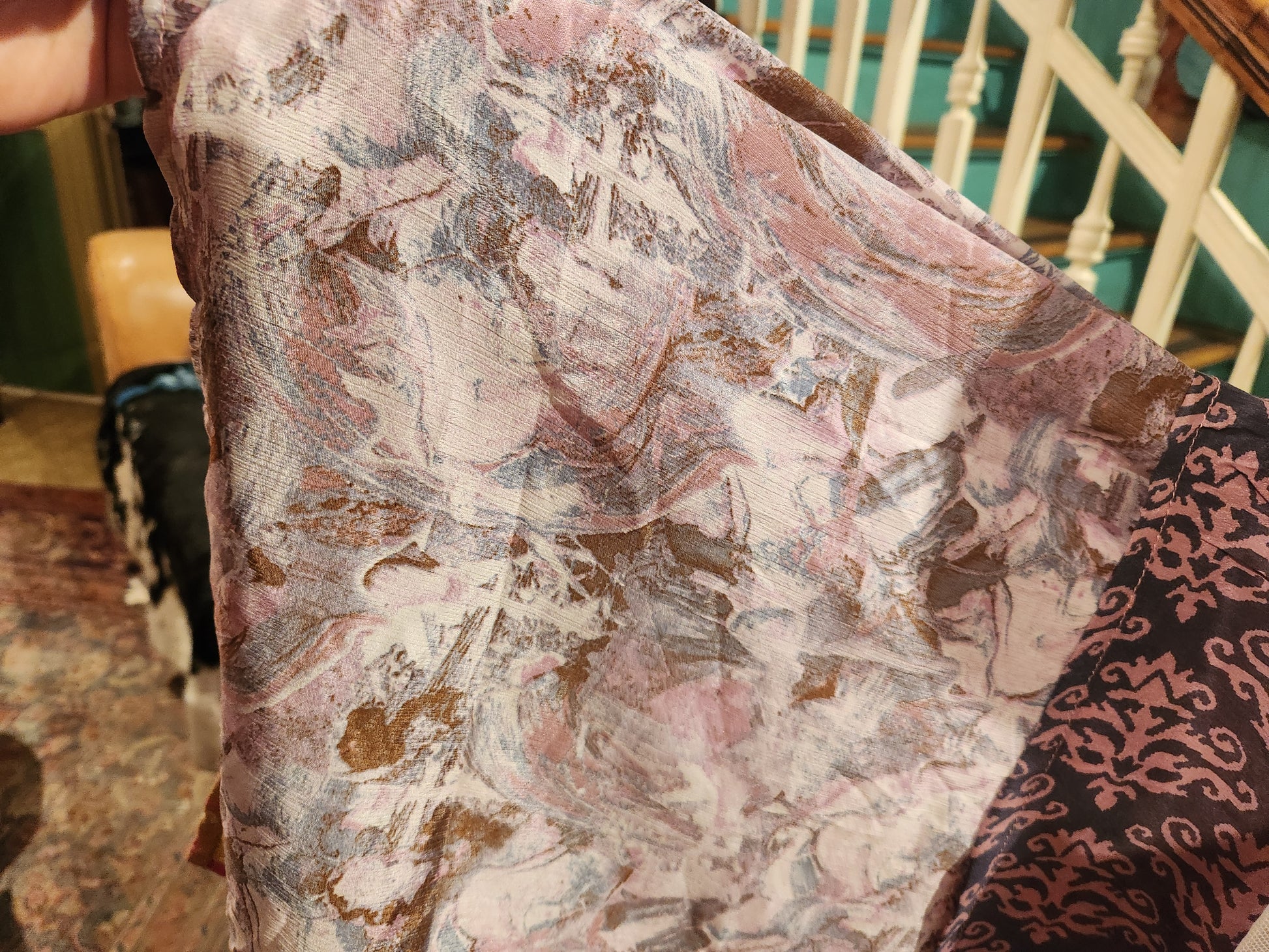 Fabrics may have small threads or holes in the layers. Color inconsistency or small stains may be present. The saris are sewn together and extend the life of each design. Imperfections should be celebrated.