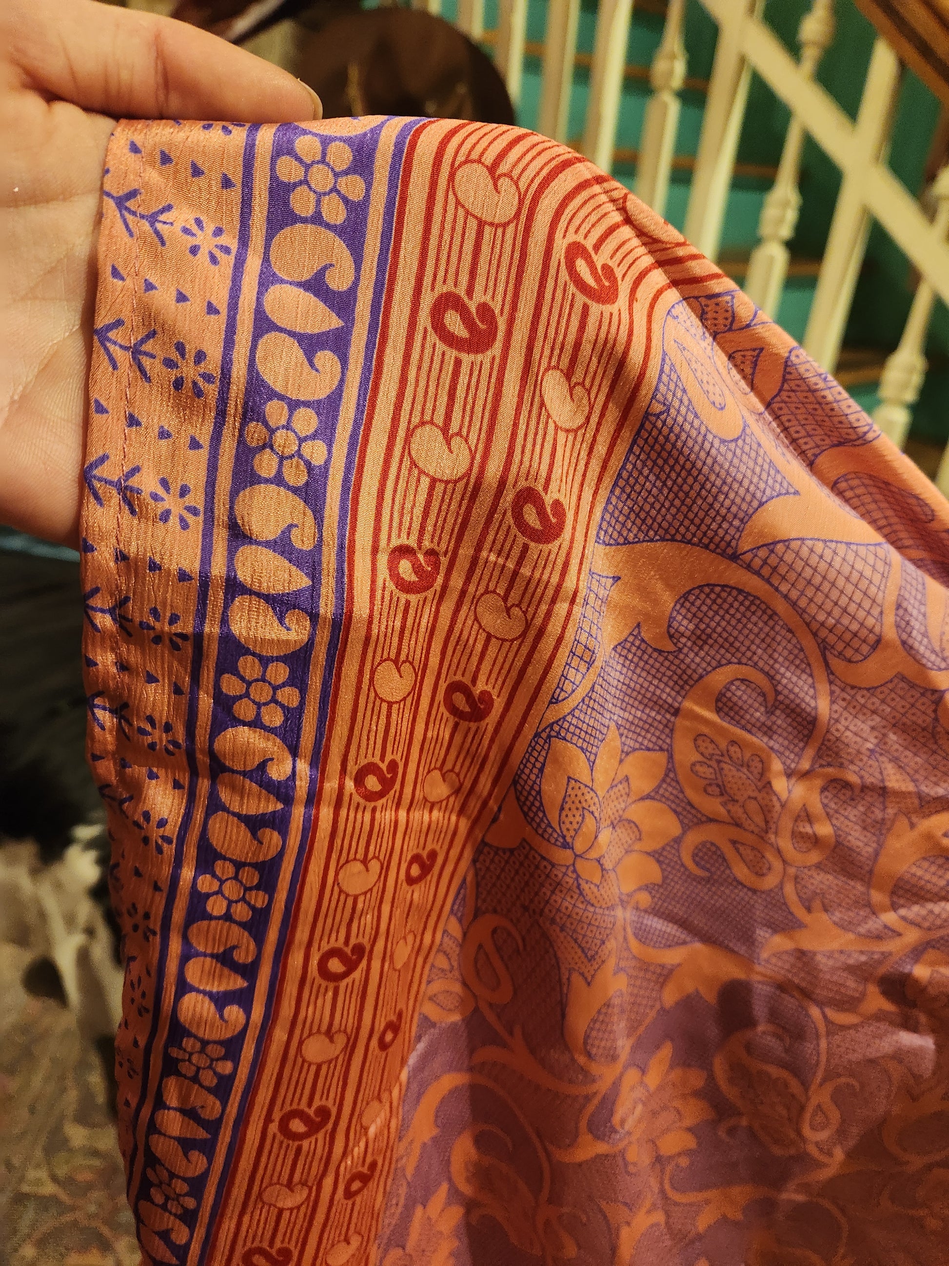 Fabrics may have small threads or holes in the layers. Color inconsistency or small stains may be present. The saris are sewn together and extend the life of each design. Imperfections should be celebrated.