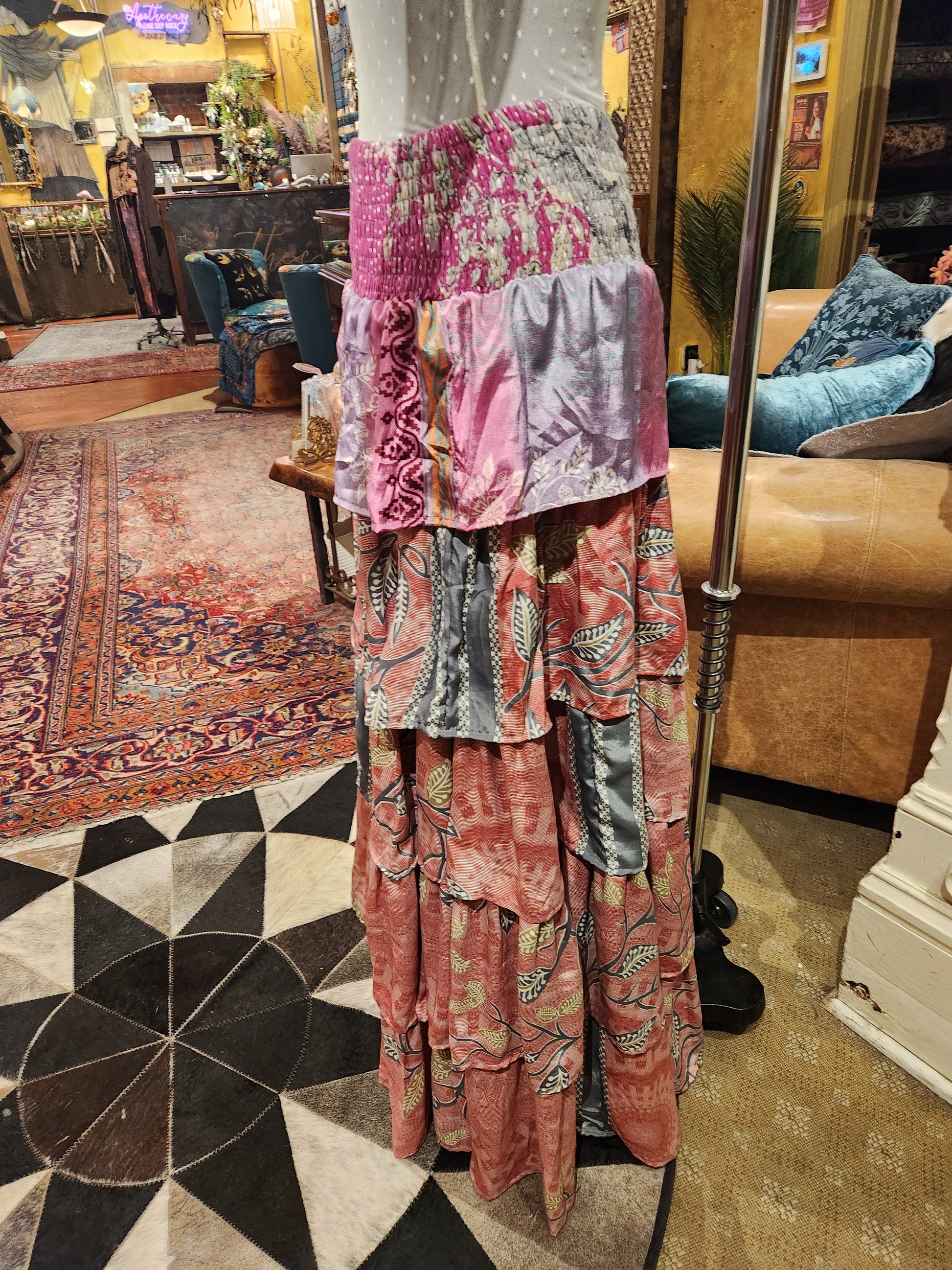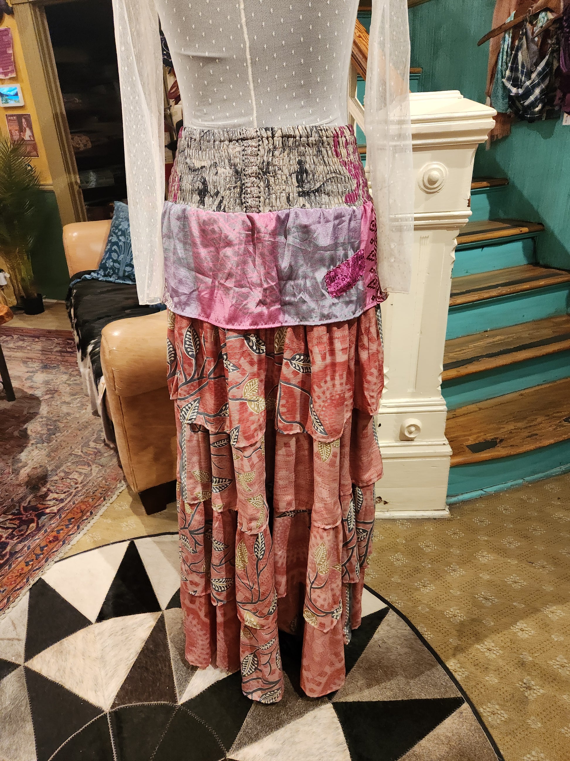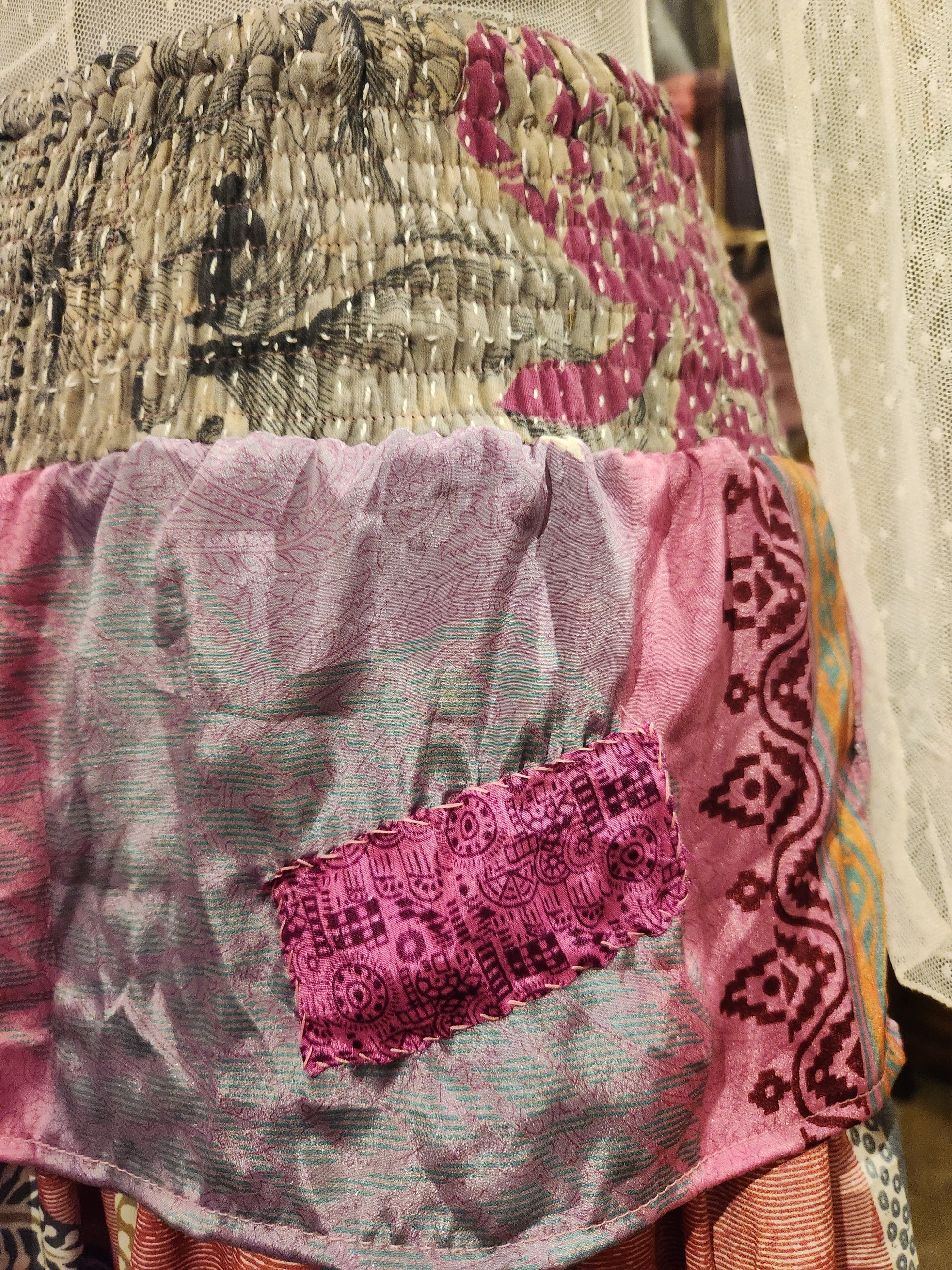Fabrics may have small threads or holes in the layers. Color inconsistency or small stains may be present. The saris are sewn together and extend the life of each design. Imperfections should be celebrated.