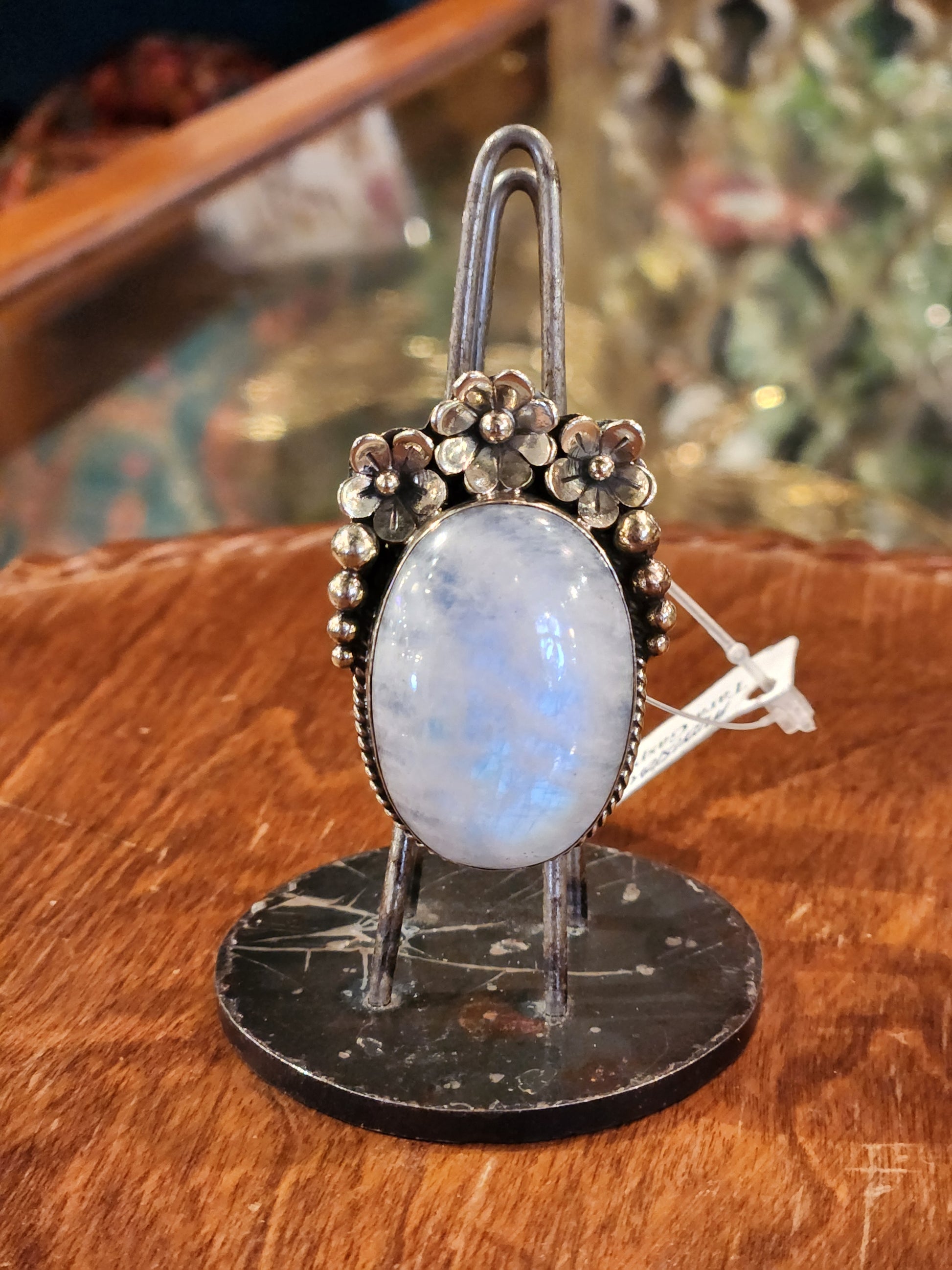 Tara Gasparian Moonstone Ring, featuring a large rounded moonstone with metal floral accents. Designs originate from vintage and antique pieces found through travel, then placed into bronze and sterling silver plated ornate ring settings. Assembled in Tara Gasparian's San Diego Studio, this piece will become a statement favorite for your everyday wear.