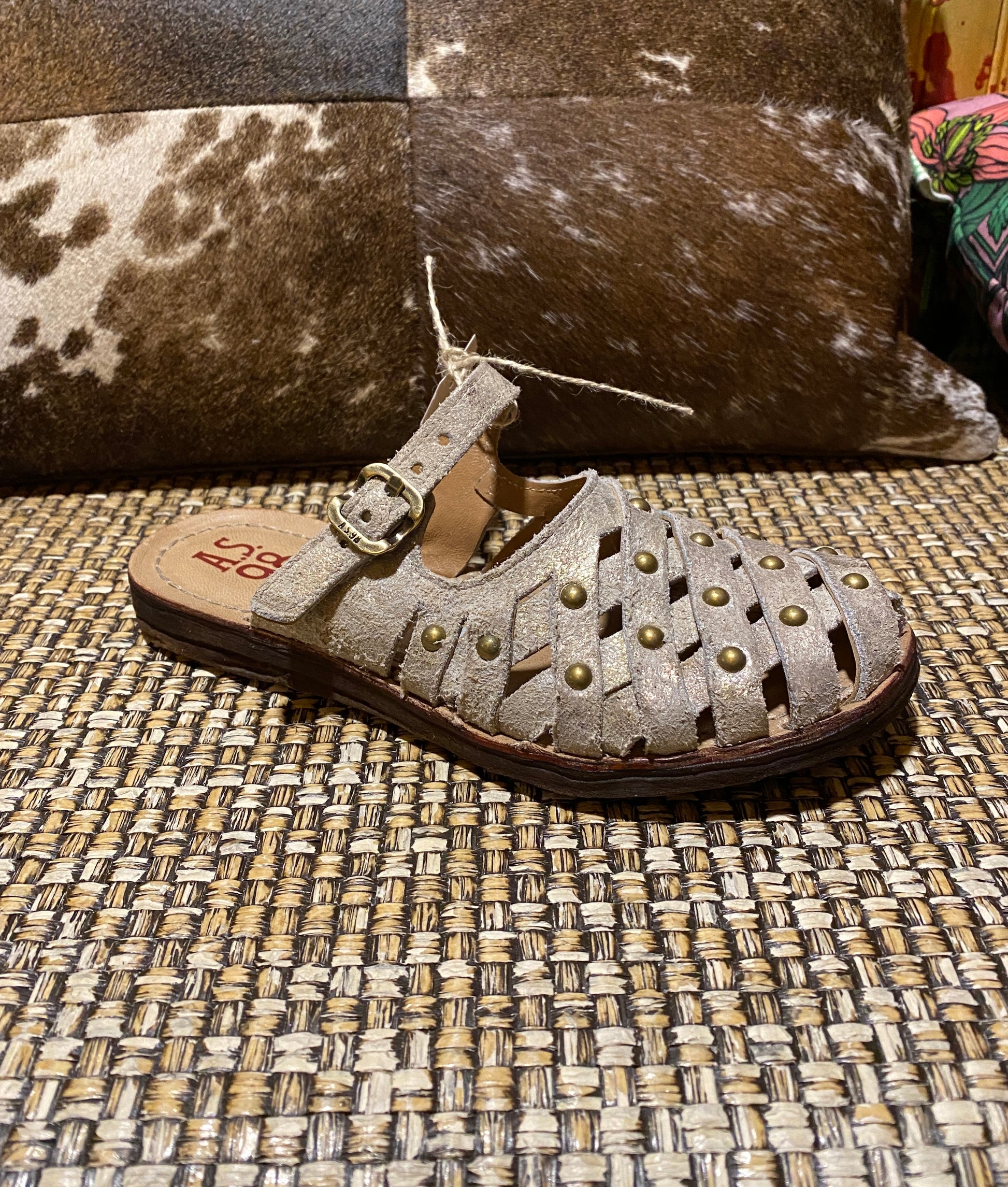 A.S.98 gives the classic mule an edge with the Ryatt. A woven, crisscrossed upper meets an adjustable Mary Jane strap with domed stud accents, for the perfect blend of bling and boho. Bold and beautifully made, itโs a shoe that captures individuality with every step.