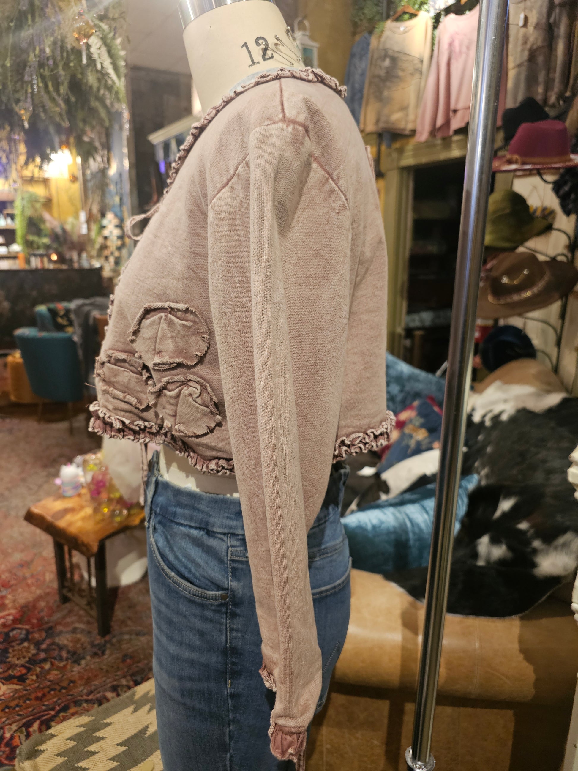 Short Jacket w/ Small Ruching & Hand Made Fabric Flowers - Brown