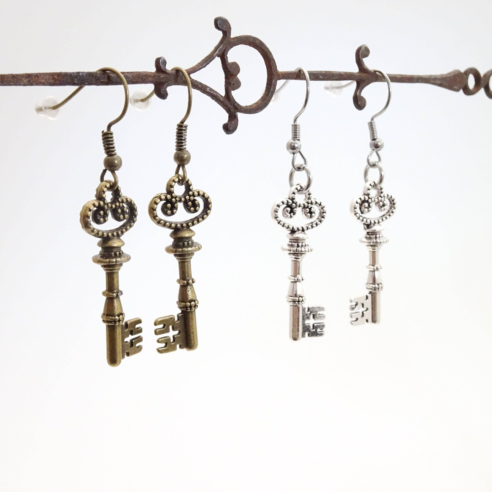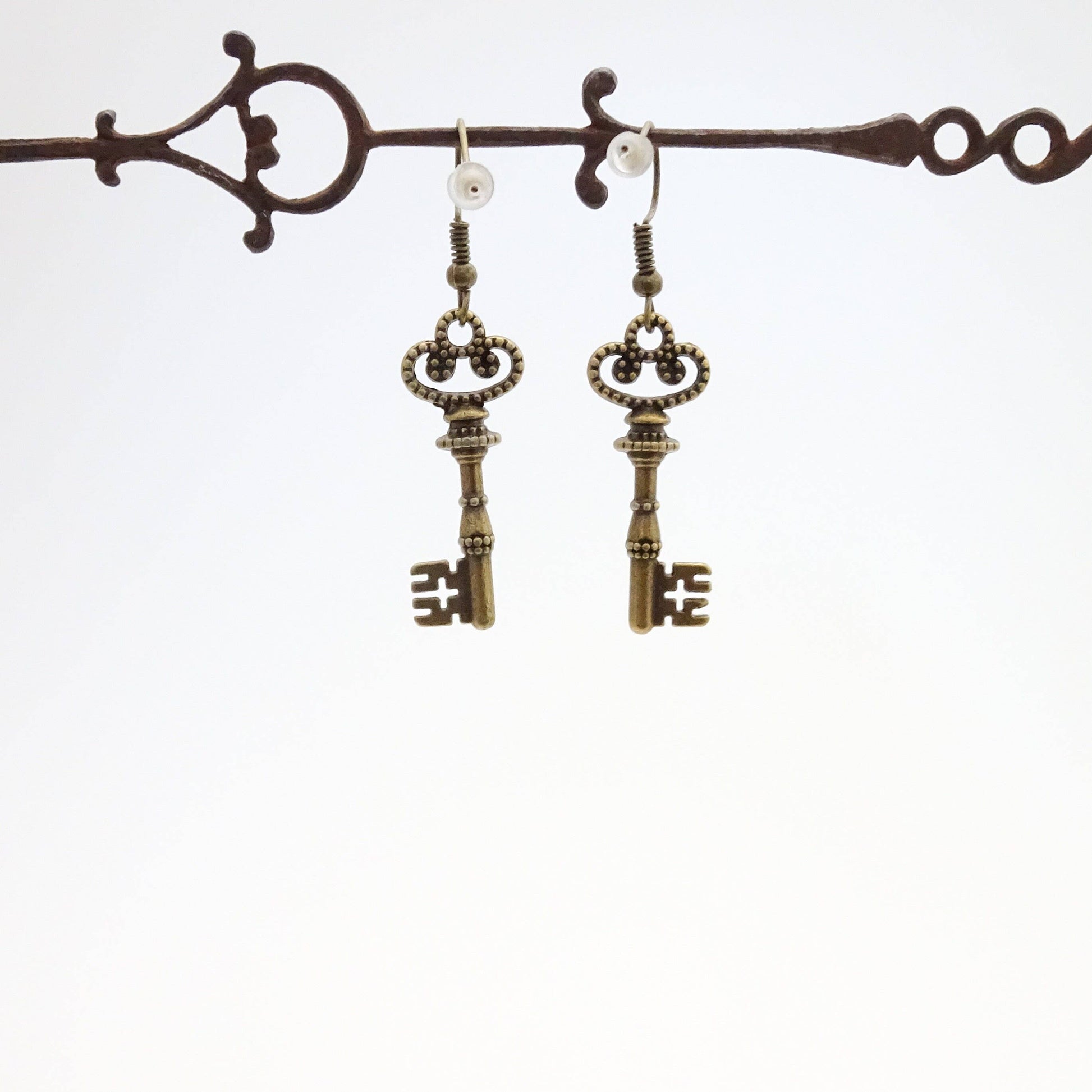 A simple and lightweight pair of skeleton key earrings. These reproduction skeleton keys are 3D and mirror-imaged for a matching pair of earrings. These look great with romantic, steampunk, Victorian, or vintage styled outfits.