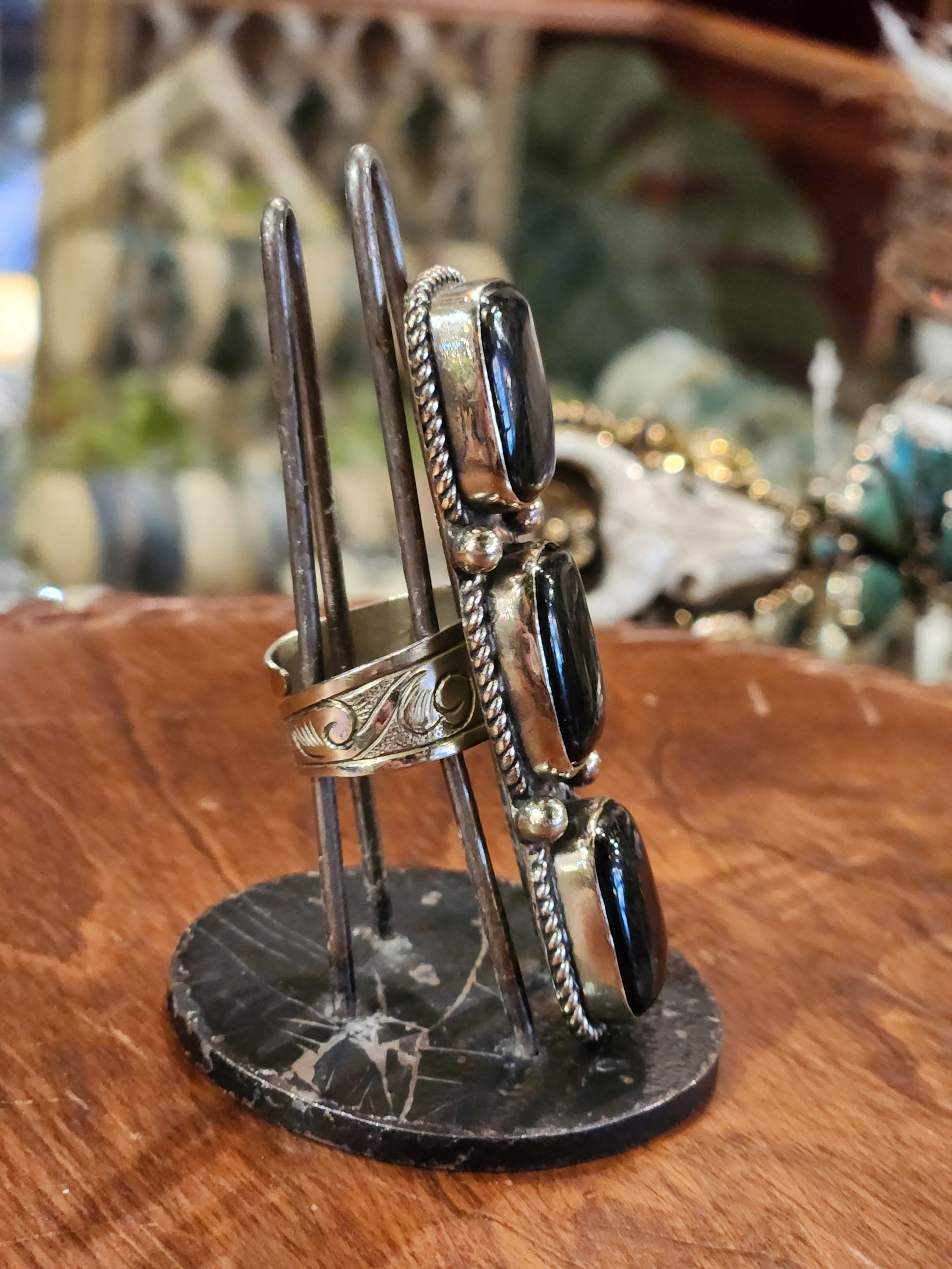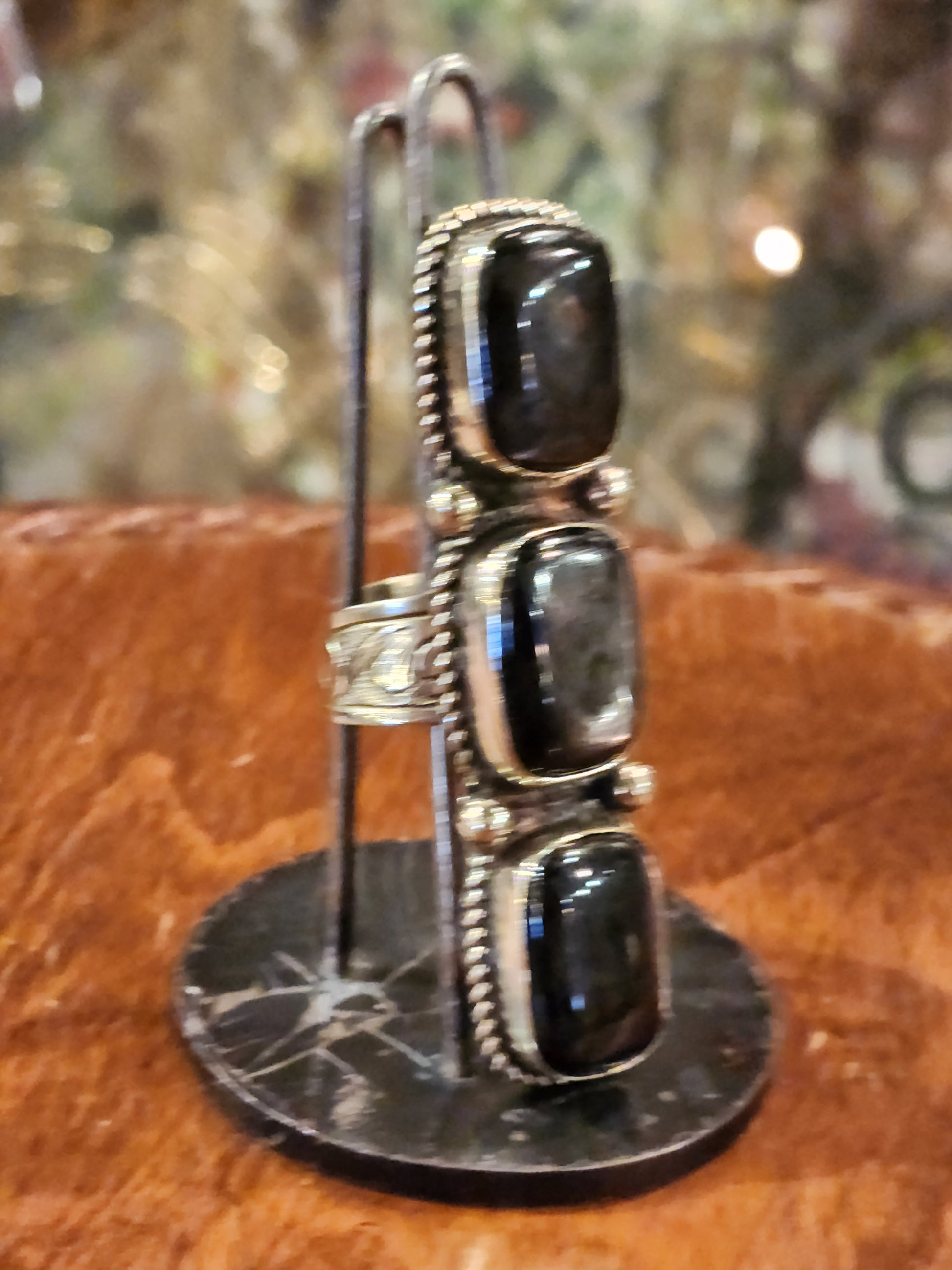 Tara Gasparian Hypersthene Ring, featuring three stacked hypersthene stones in a vertical layout. Designs originate from vintage and antique pieces found through travel, then placed into bronze and sterling silver plated ornate ring settings. Assembled in Tara Gasparian's San Diego Studio, this piece will become a statement favorite for your everyday wear.