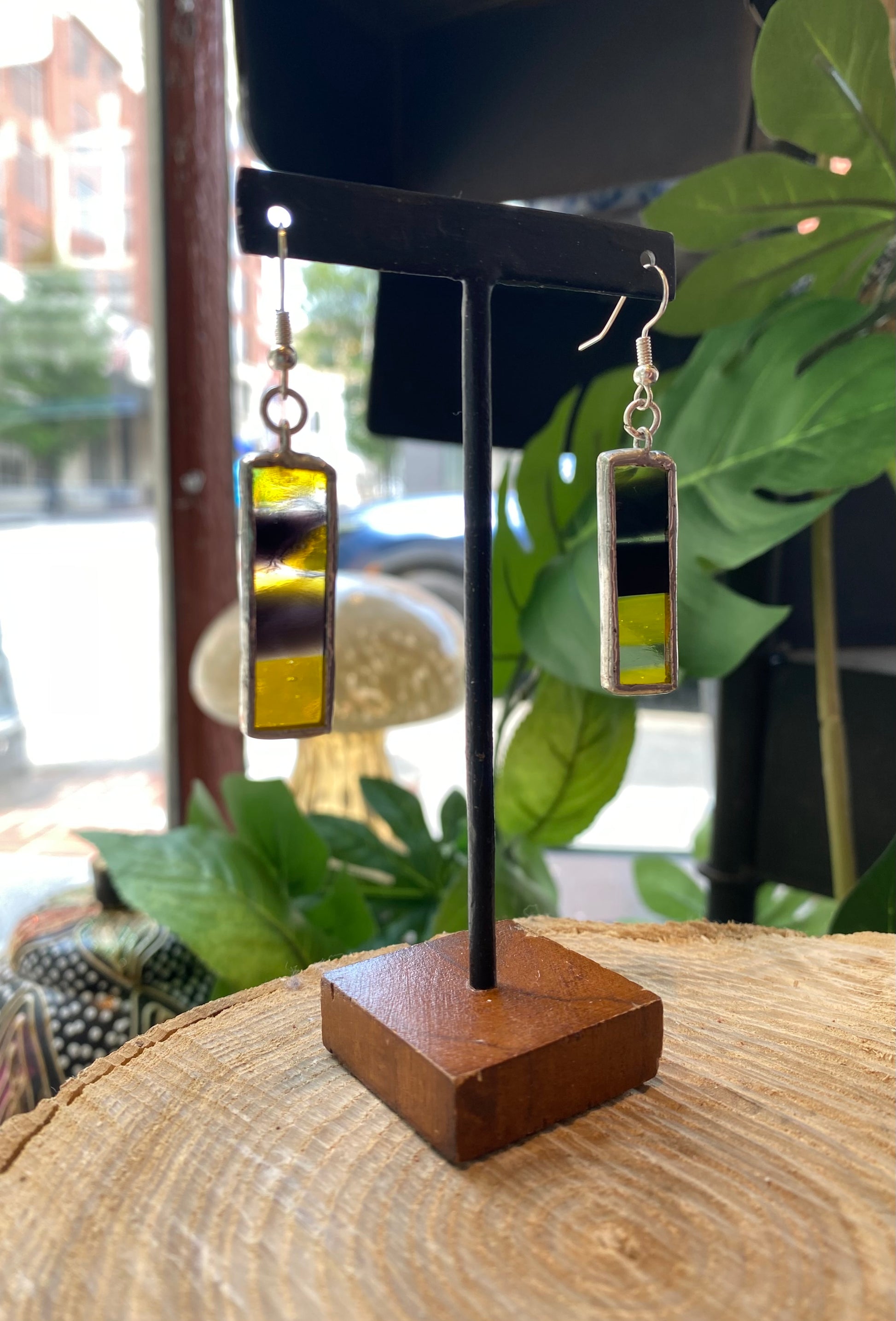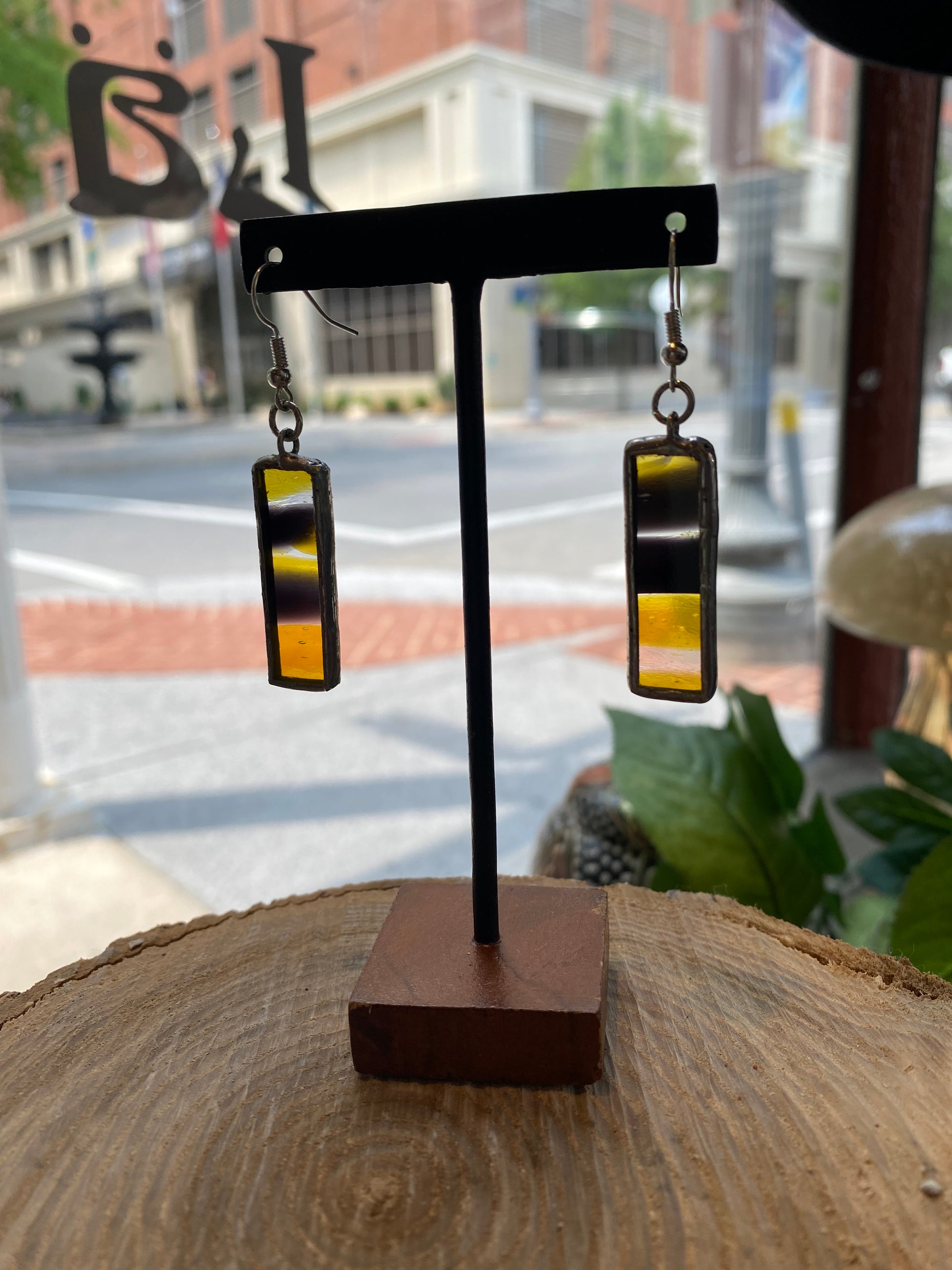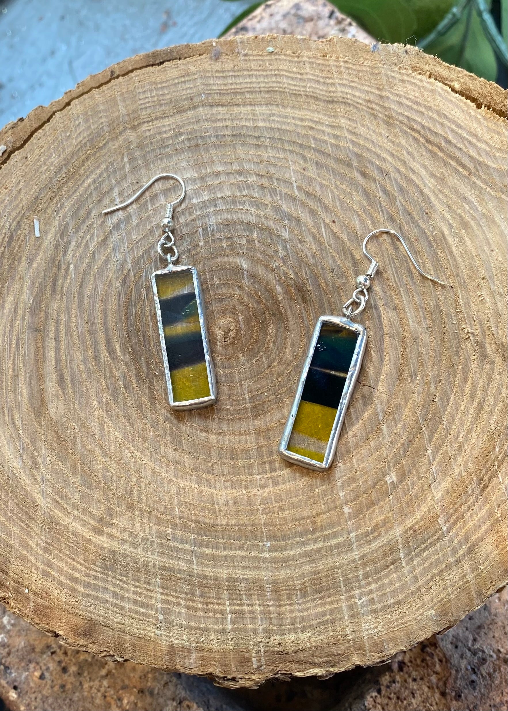 Stained glass rectangle earrings, approximately 1.25 in (l) x .5 in (w). Hypoallergenic stainless steel findings, and lead-free solder.ย