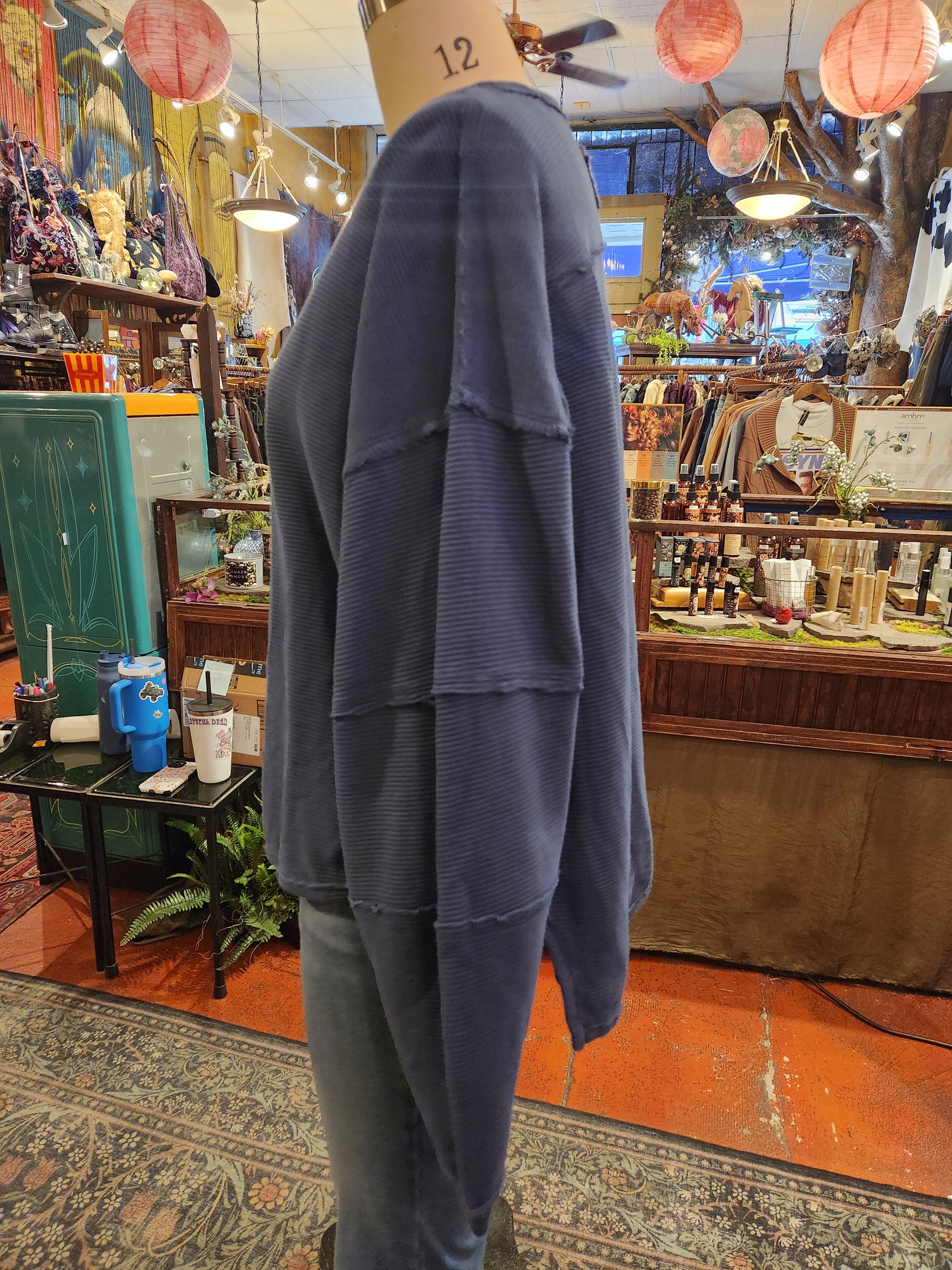 Features: Ribbed fabrication, scoop-neckline, drop-shoulder sleeves with cuffs, defined seam detailing with raw trim