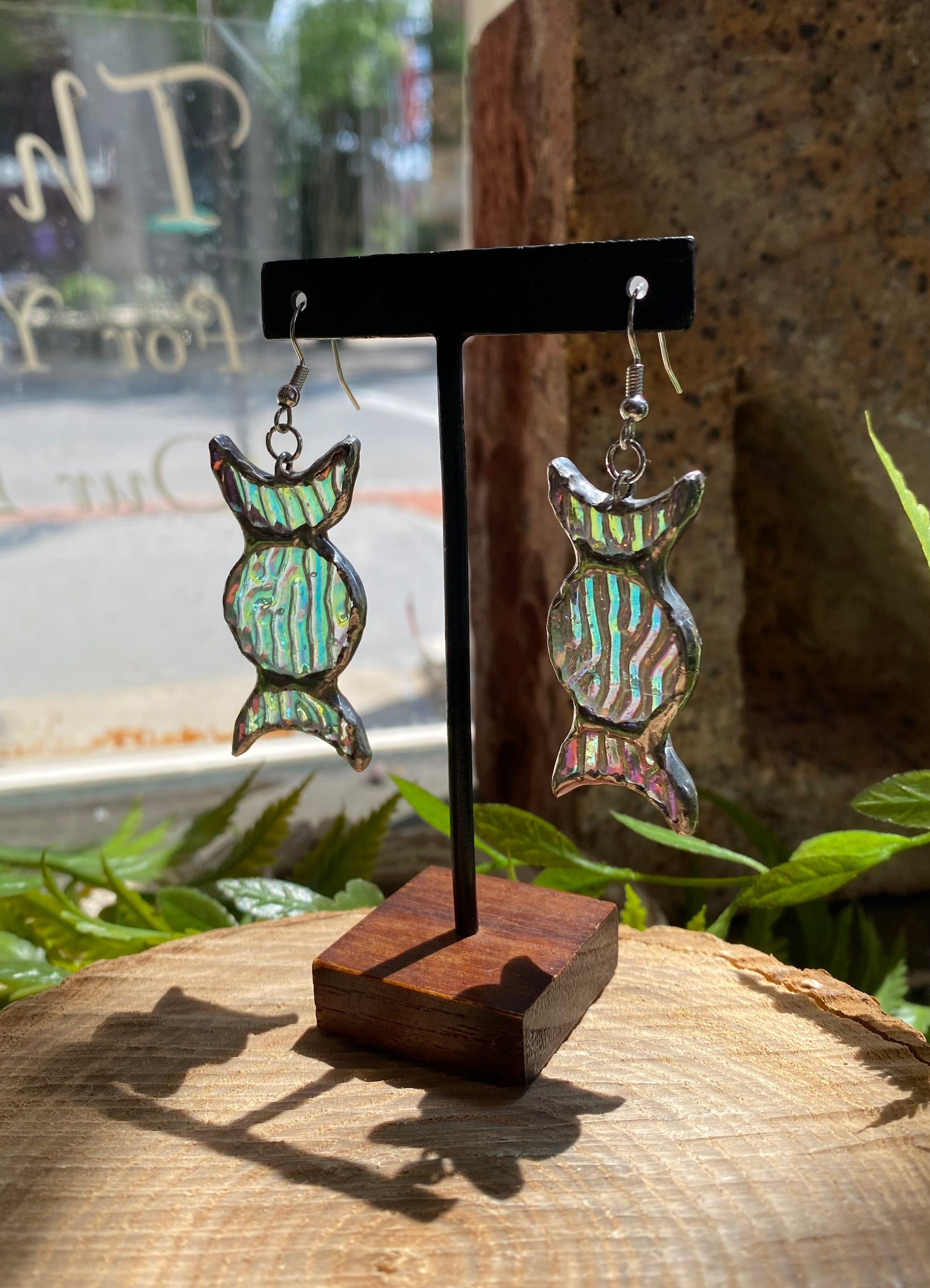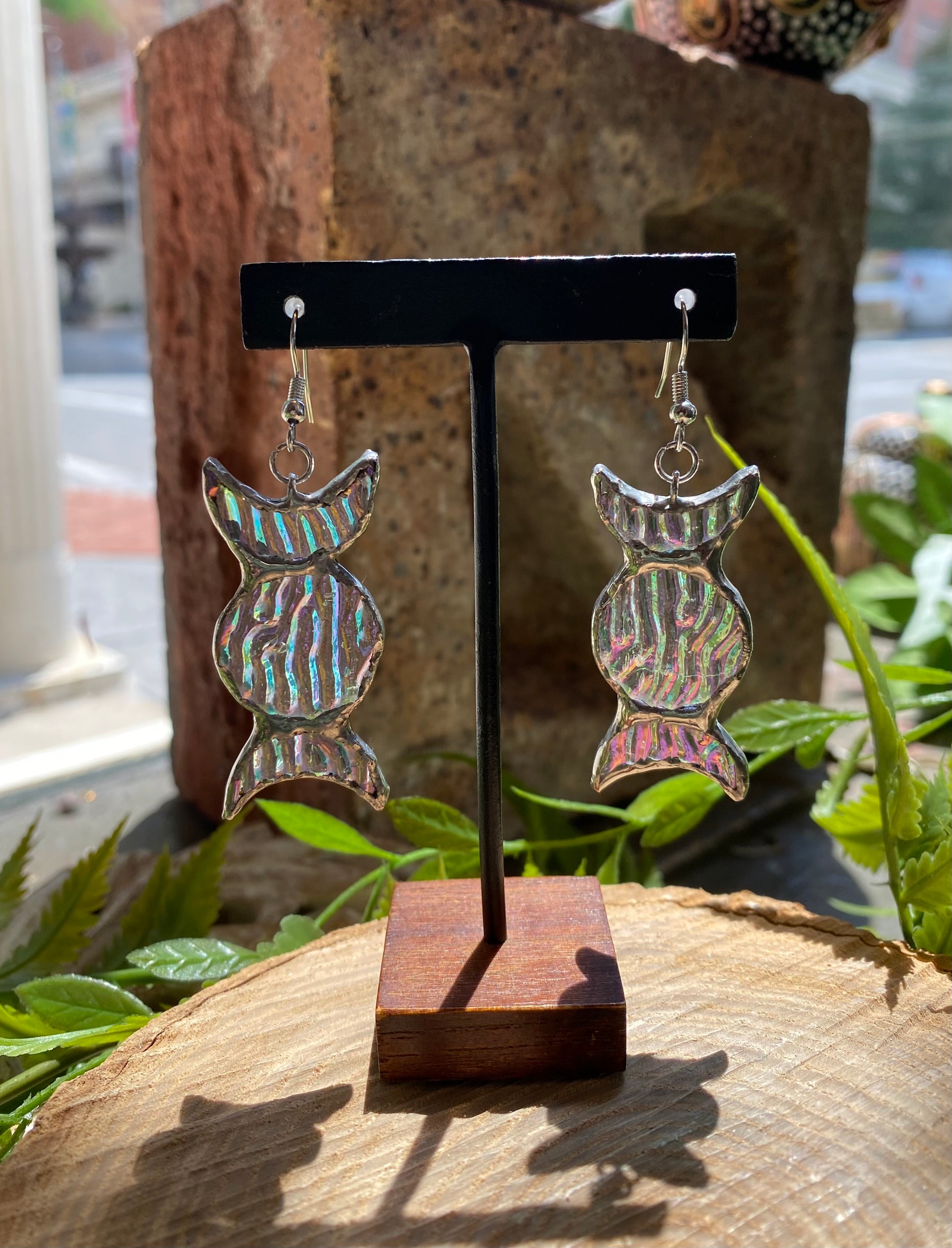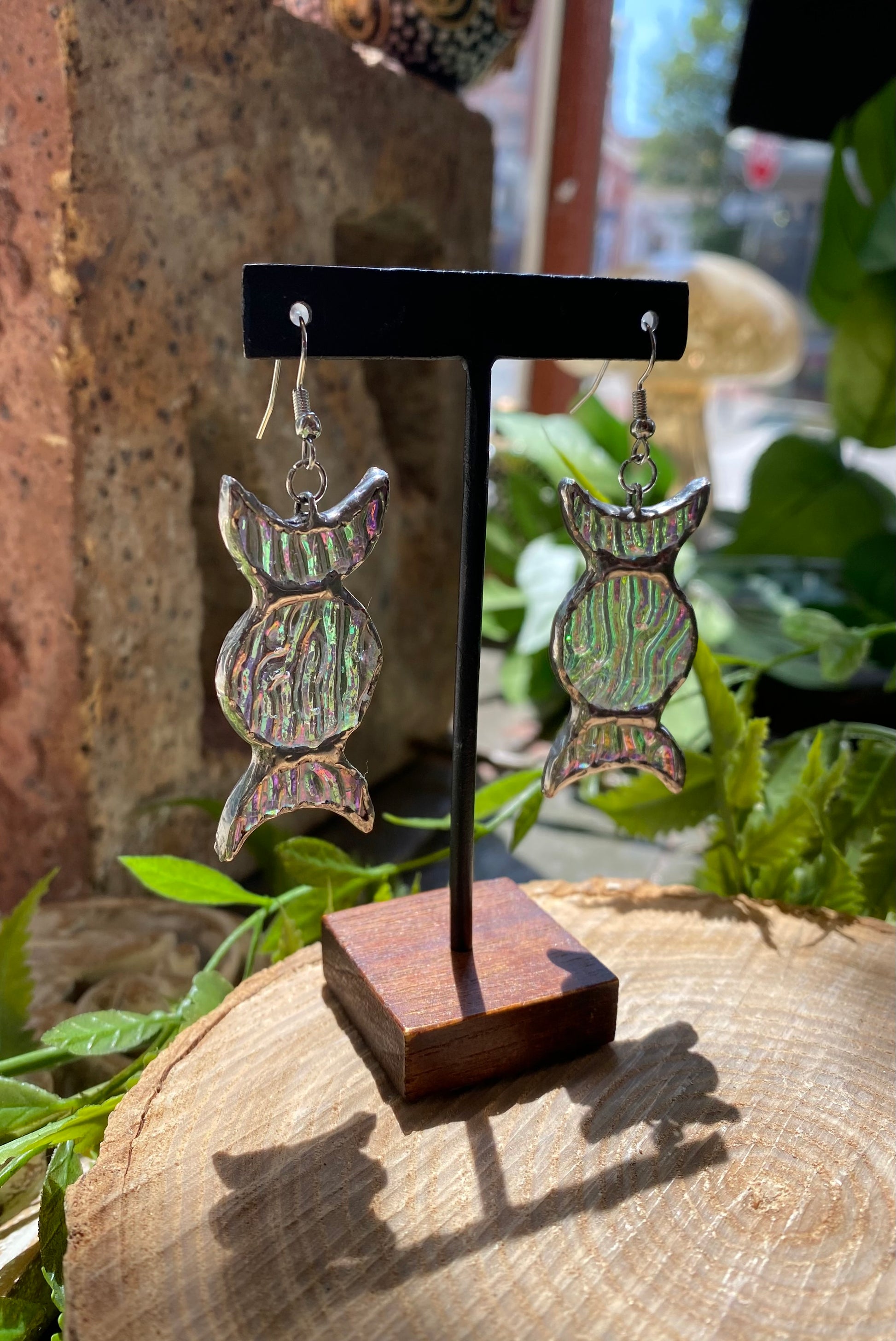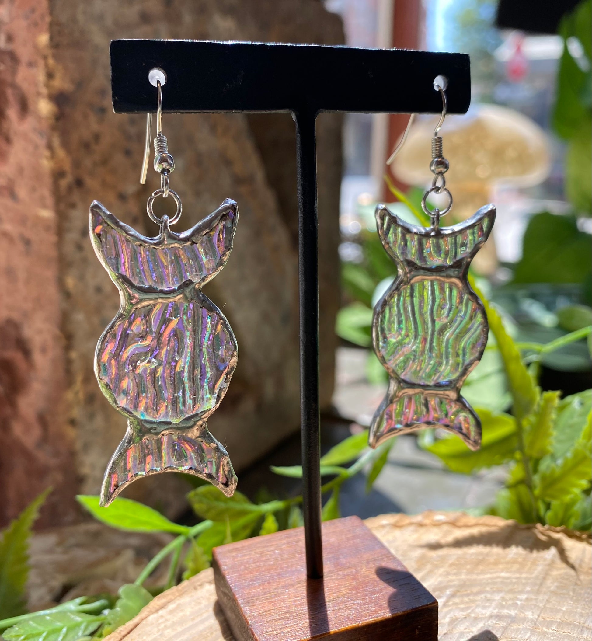 Triple goddess moon shaped earrings made with dichroic glass, approximately 2 in (l) x 1 in (w). Hypoallergenic stainless steel findings, and lead-free solder.ย