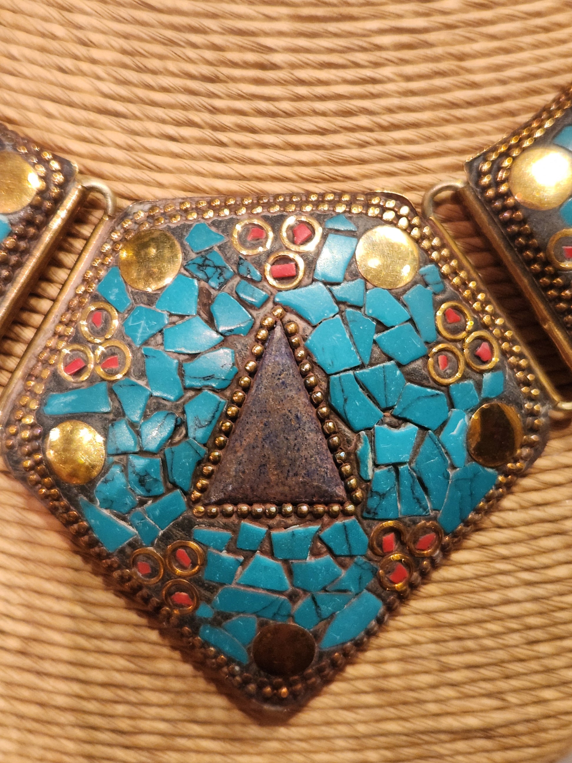 Make a bold fashion statement with this striking turquoise collar necklace. Featuring vibrant turquoise chips arranged in an eye-catching mosaic pattern, this piece commands attention with its distinctive style. The metal construction ensures durability while the statement collar design frames your neckline beautifully.