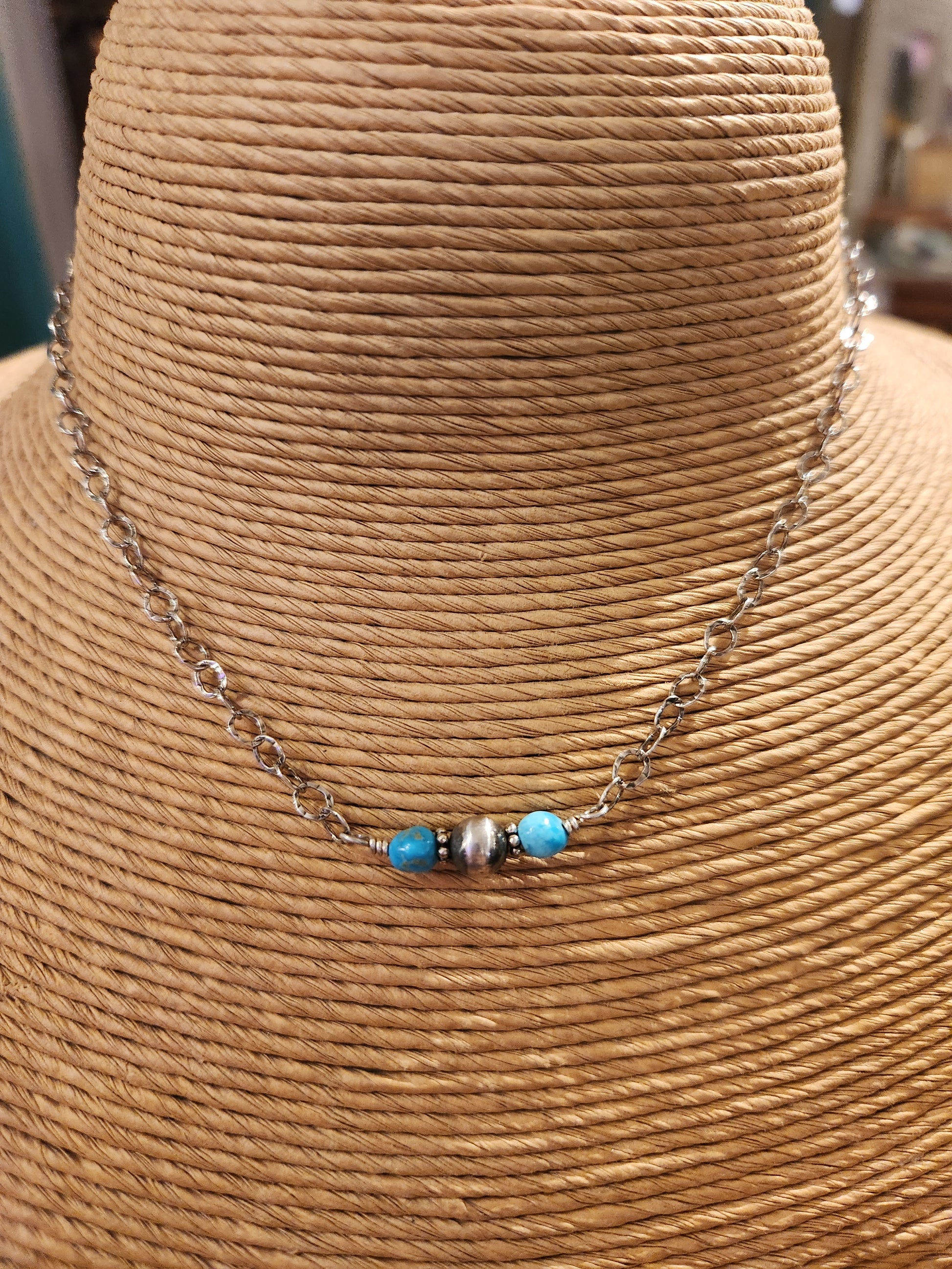 Discover effortless elegance with this striking turquoise and Navajo bead sterling silver necklace. The sterling silver chain provides a polished foundation that lets the vibrant turquoise take center stage. Lightweight yet impactful, this necklace transitions seamlessly from casual to dressed-up occasions.