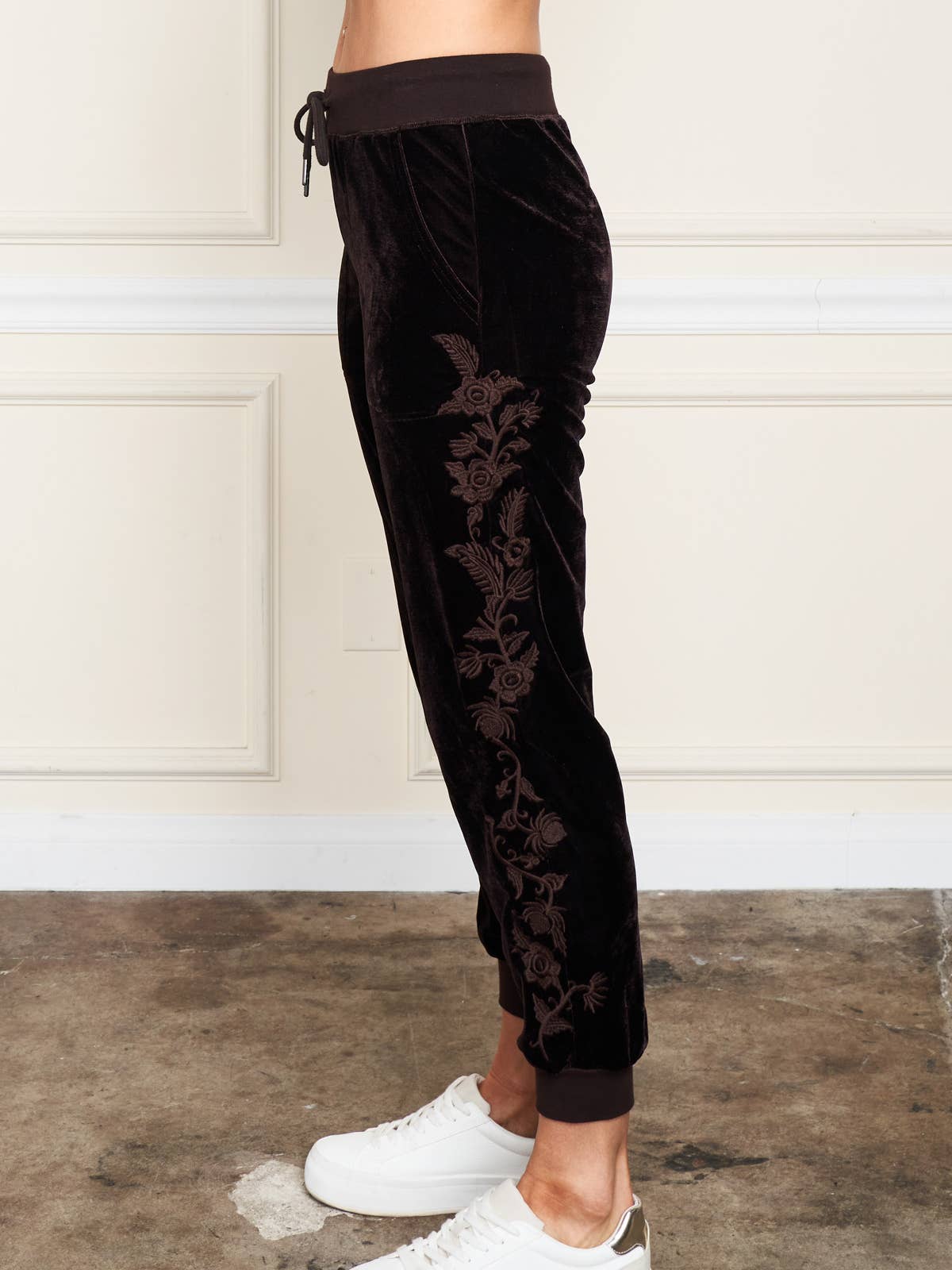 Elevate your loungewear game with our incredibly soft joggers. Designed for ultimate comfort, this pull-on style features a fully elastic waist with an adjustable drawstring for a perfect fit. Enjoy the practicality of side slash pockets and the cozy rib knit detailing at the waist and cuffs. Adorned with beautiful tonal floral embroidery, these joggers exude retro, romantic, and western boho vibes that make them a standout choice for relaxed days at home or casual outings. Treat yourself to a blend of style and comfort that you wonโt want to take off.