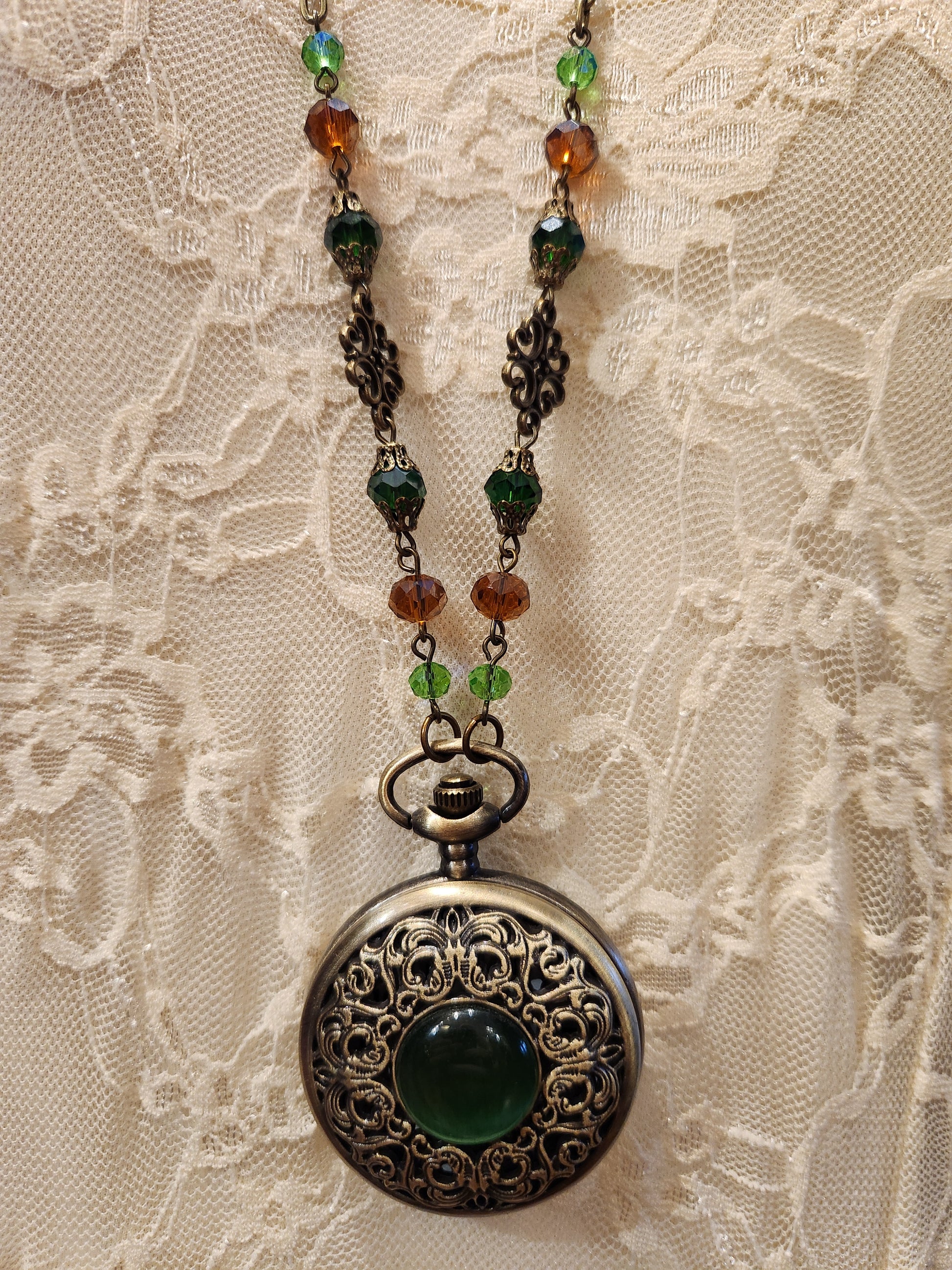 Victorian Style Pocket Watch Necklace | Green Gem Locket