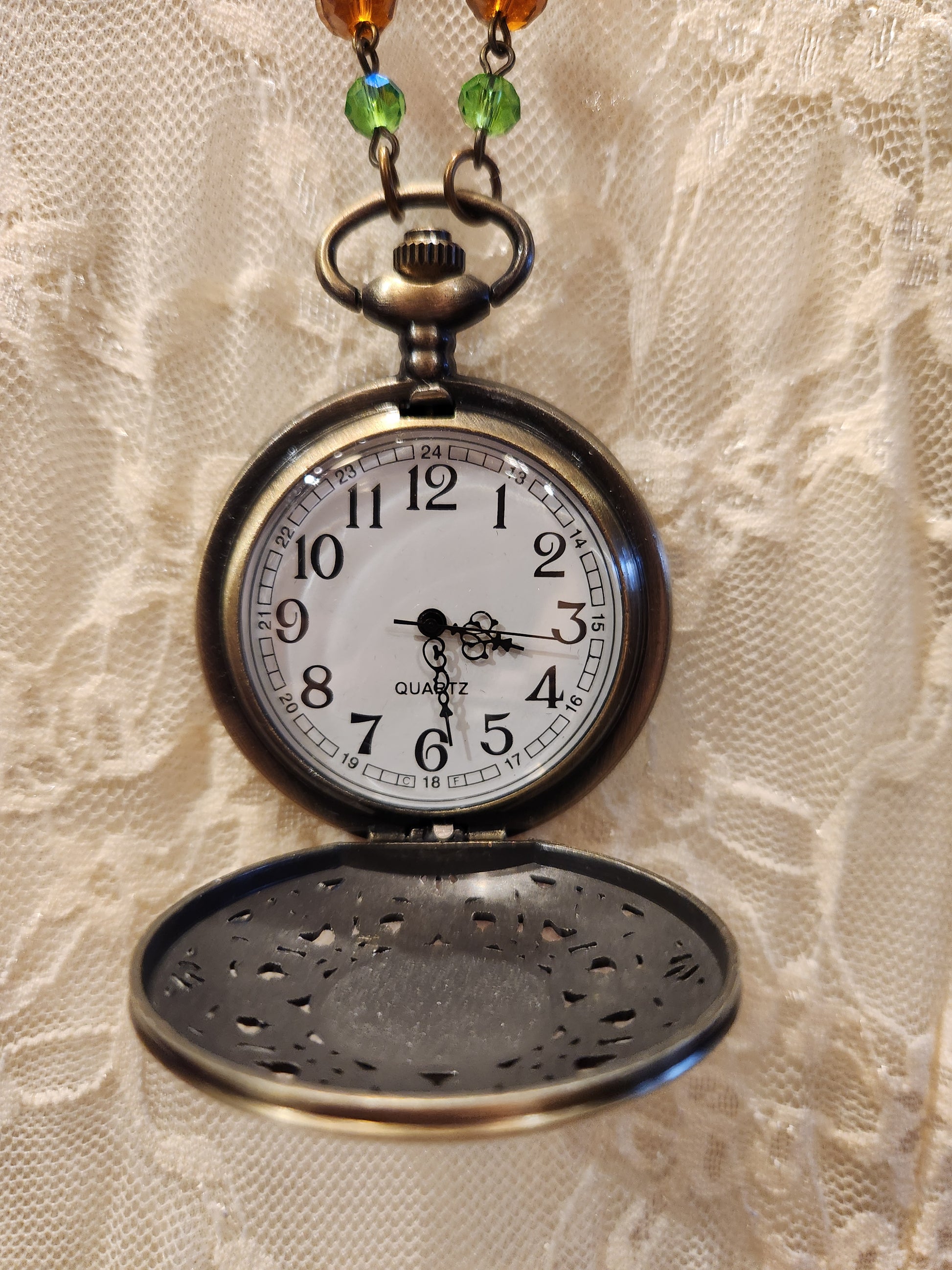 A reproduction pocket watch with a Victorian feel! An eye-catching conversation starter as fun to wear as it is useful. These lovely watches are a customer favorite wherever I take them.