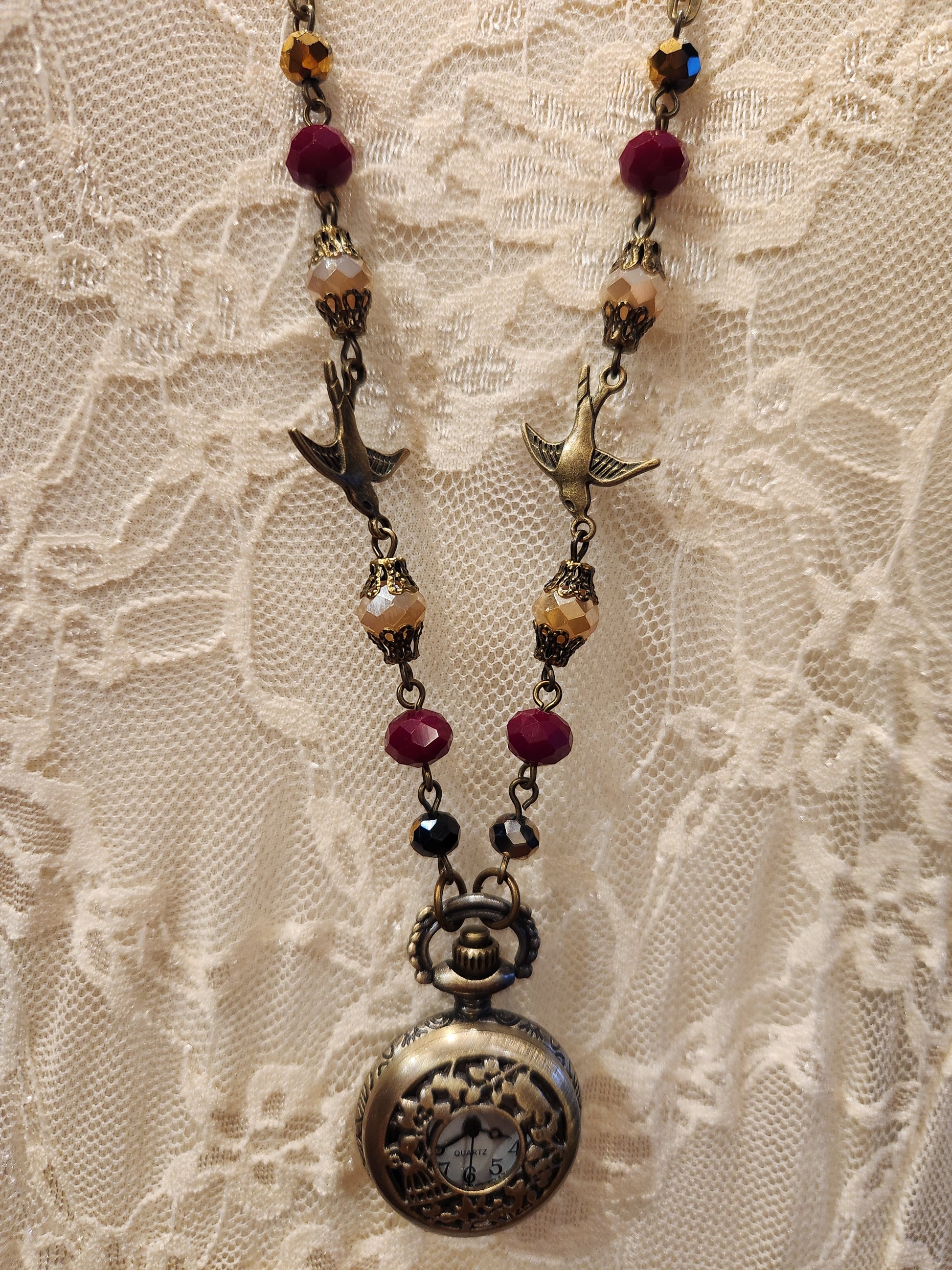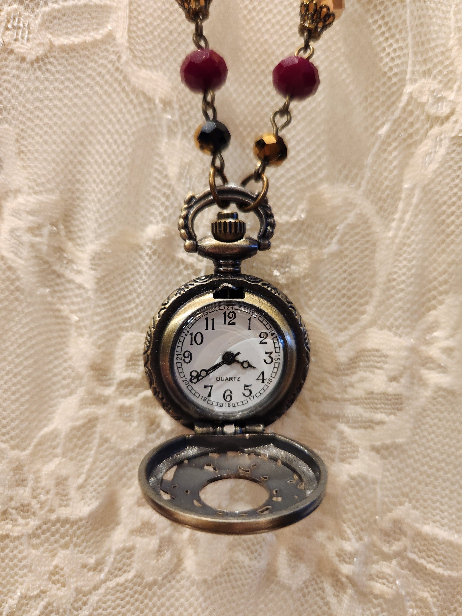 A reproduction pocket watch with a Victorian feel! An eye-catching conversation starter as fun to wear as it is useful. These lovely watches are a customer favorite wherever I take them.