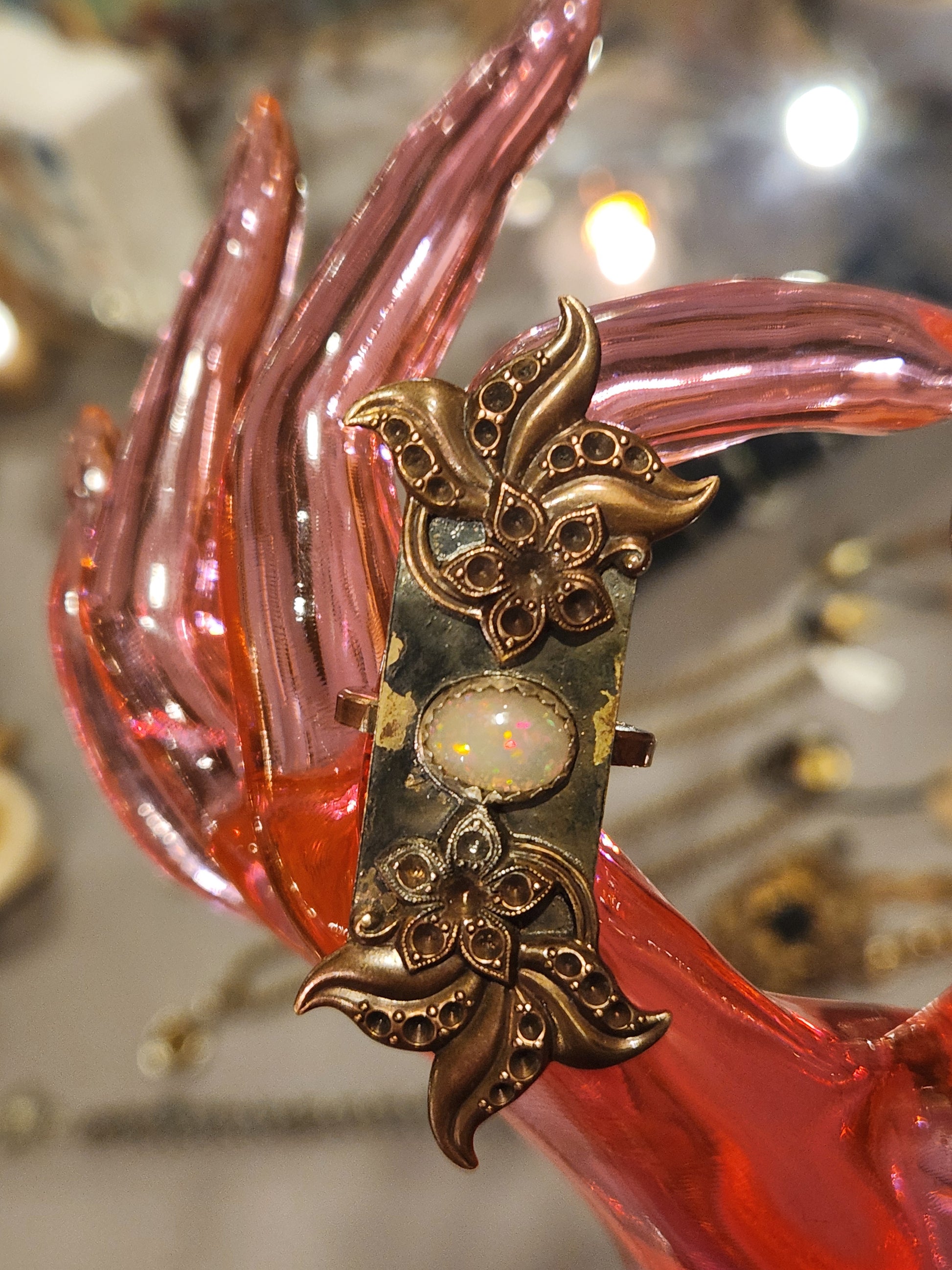 This statement ring features reclaimed and repurposed vintage floral accents alongside an opal focal point. A wearable work of art that transforms forgotten materials into something truly magical.