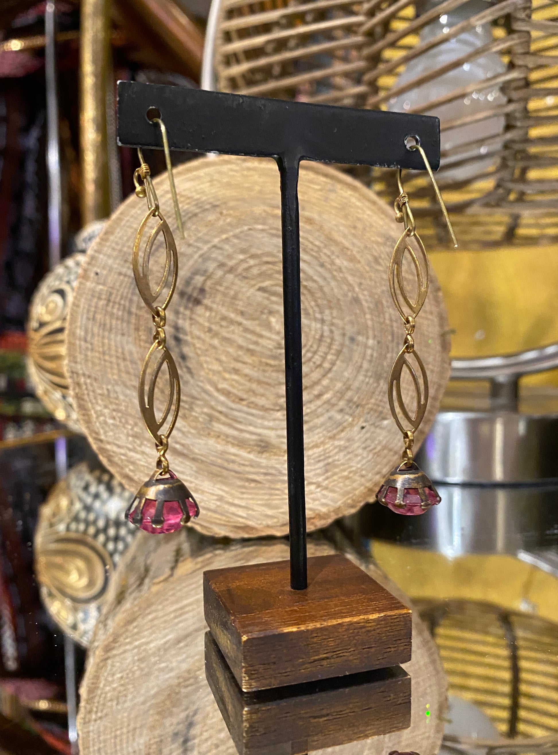Vintage Glass & Brass Chain Earrings - Pink