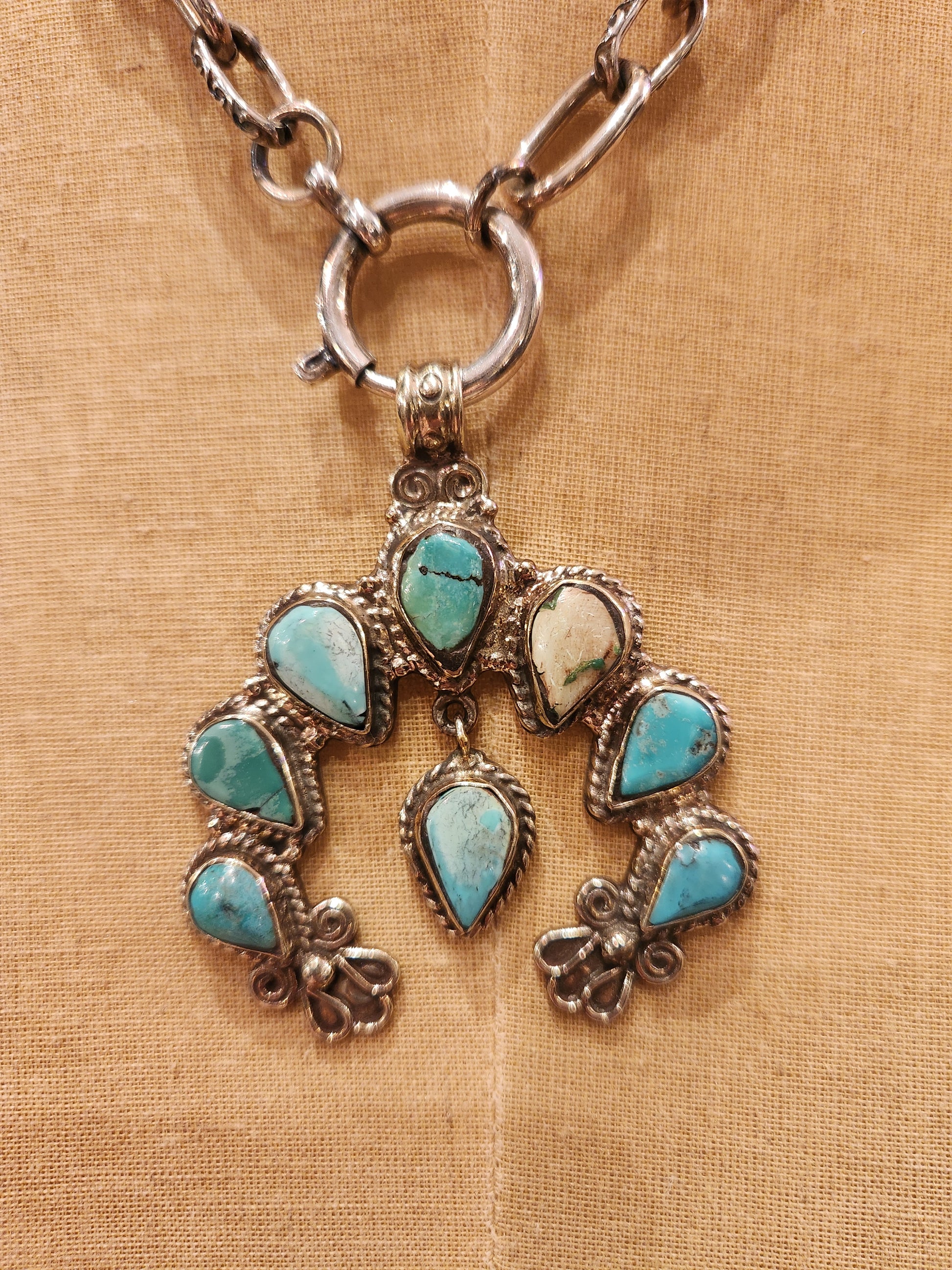 OOAK Vintage Sterling Plated Chain with Turquoise Squash Blossom