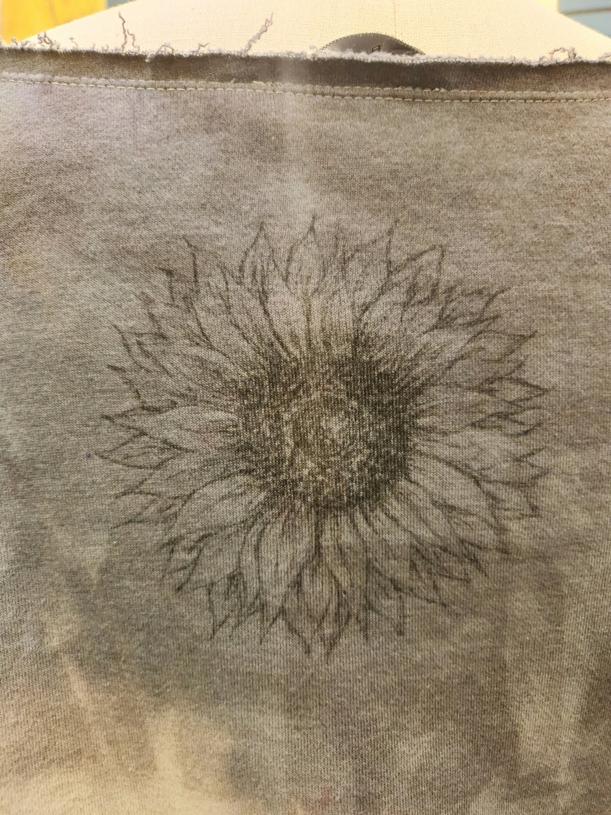 Off the shoulder crewneck adorned with an original sunflower painting on the front and back of the garment.