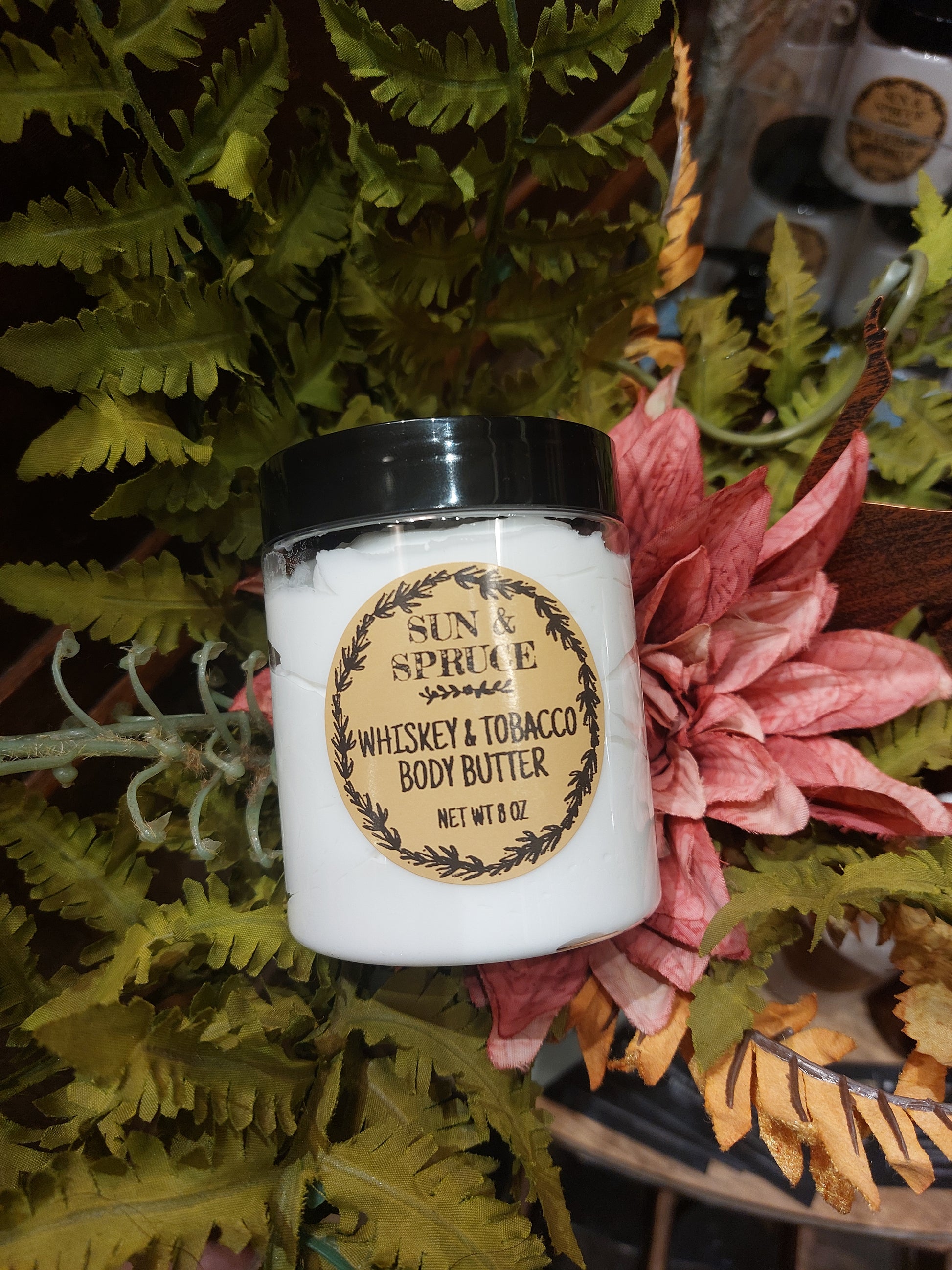 Towel dry after exfoliating and cleansing. Scoop out a little body butter with fingers. Spread over skin sparingly or generously depending on how dry you are. Made to match our Whiskey & Tobacco Handmade Soap, this enriching lotion is a blend of pipe tobacco & bourbon!